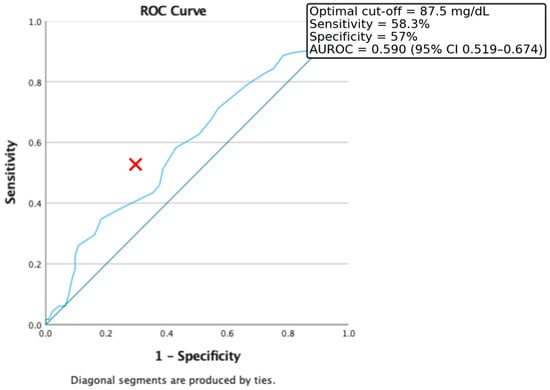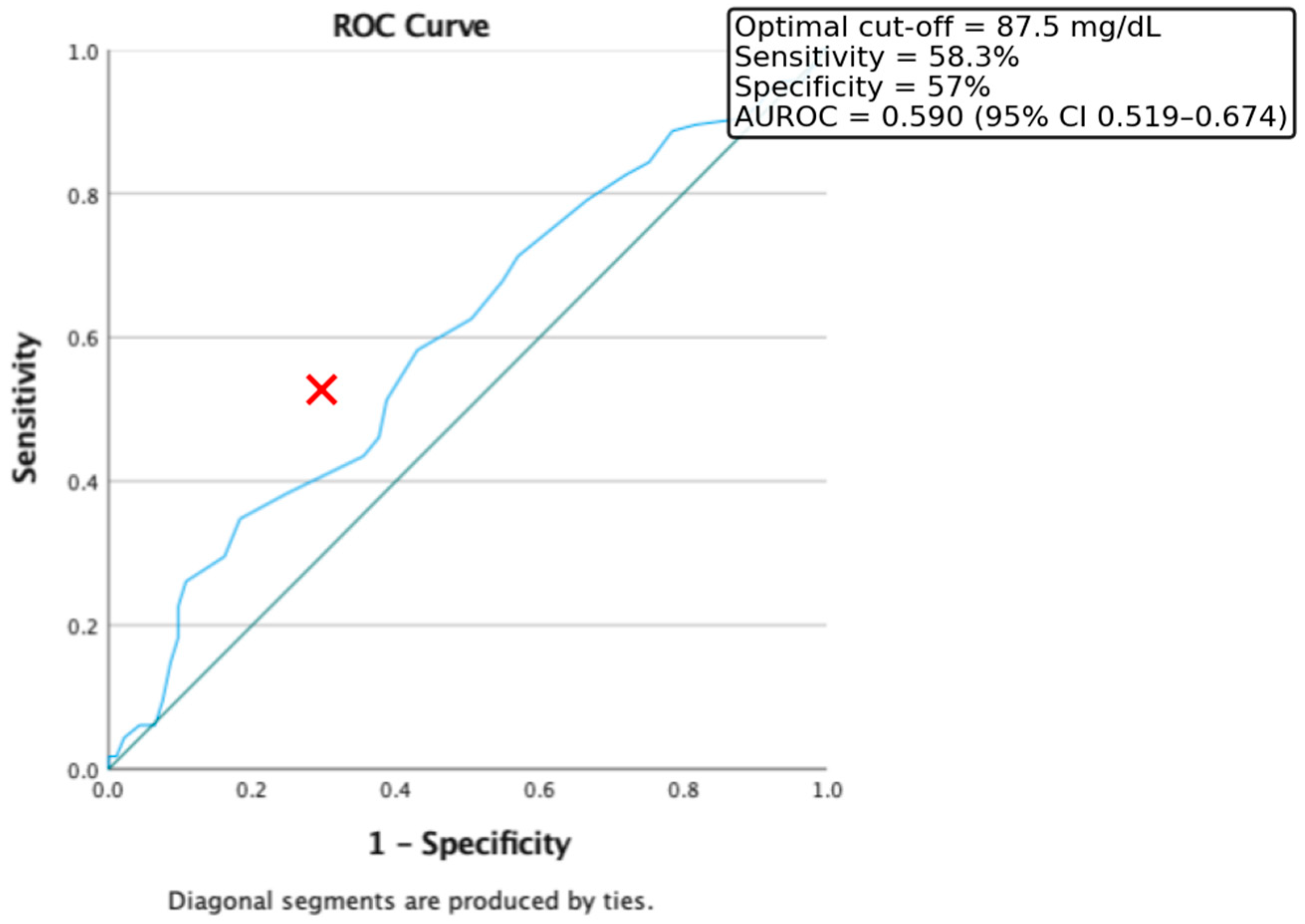 Furthermore, ROC curve analysis was used to evaluate the discriminative power of fasting blood glucose levels in identifying insulin resistance, defined as HOMA-IR > 2. In our study population, the optimal threshold was 87.5 mg/dL, which provided a sensitivity of 58.3% and a specificity of 57%. The area under the ROC curve (AUROC) was 0.59 (CI = 0.519–0.674) (