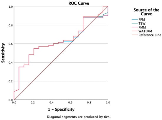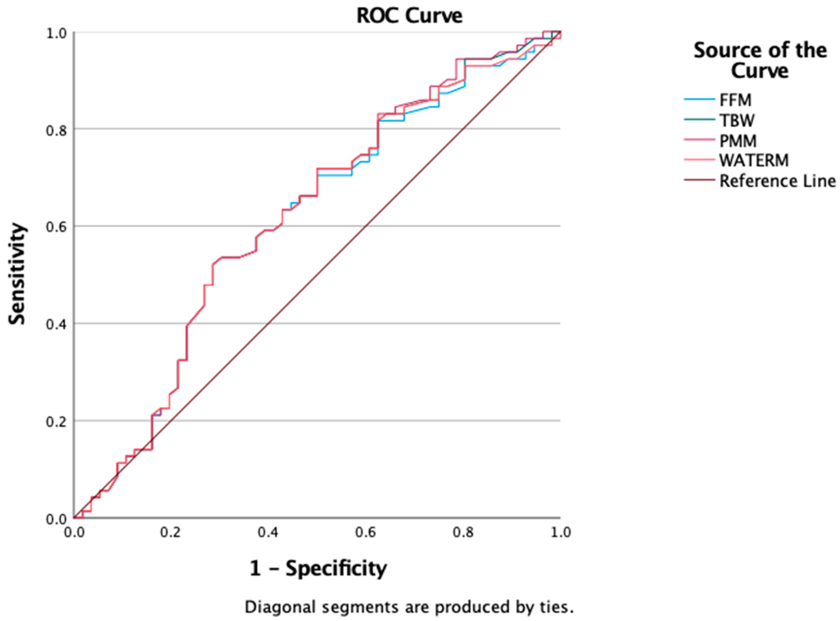 Finally, ROC curve analysis was conducted to evaluate the discriminatory capacity of bioimpedance analysis (BIA) parameters—total body water (TBW), fat-free mass (FFM), predicted muscle mass (PMM), and water mass (WATERM)—in distinguishing obesity from overweight as defined by BMI. In our cohort, all four parameters showed comparable AUROC values: FFM = 0.607 (95% CI: 0.506–0.708), TBW = 0.614 (95% CI: 0.514–0.715), PMM = 0.617 (95% CI: 0.517–0.717), and WATERM = 0.612 (95% CI: 0.511–0.712) (