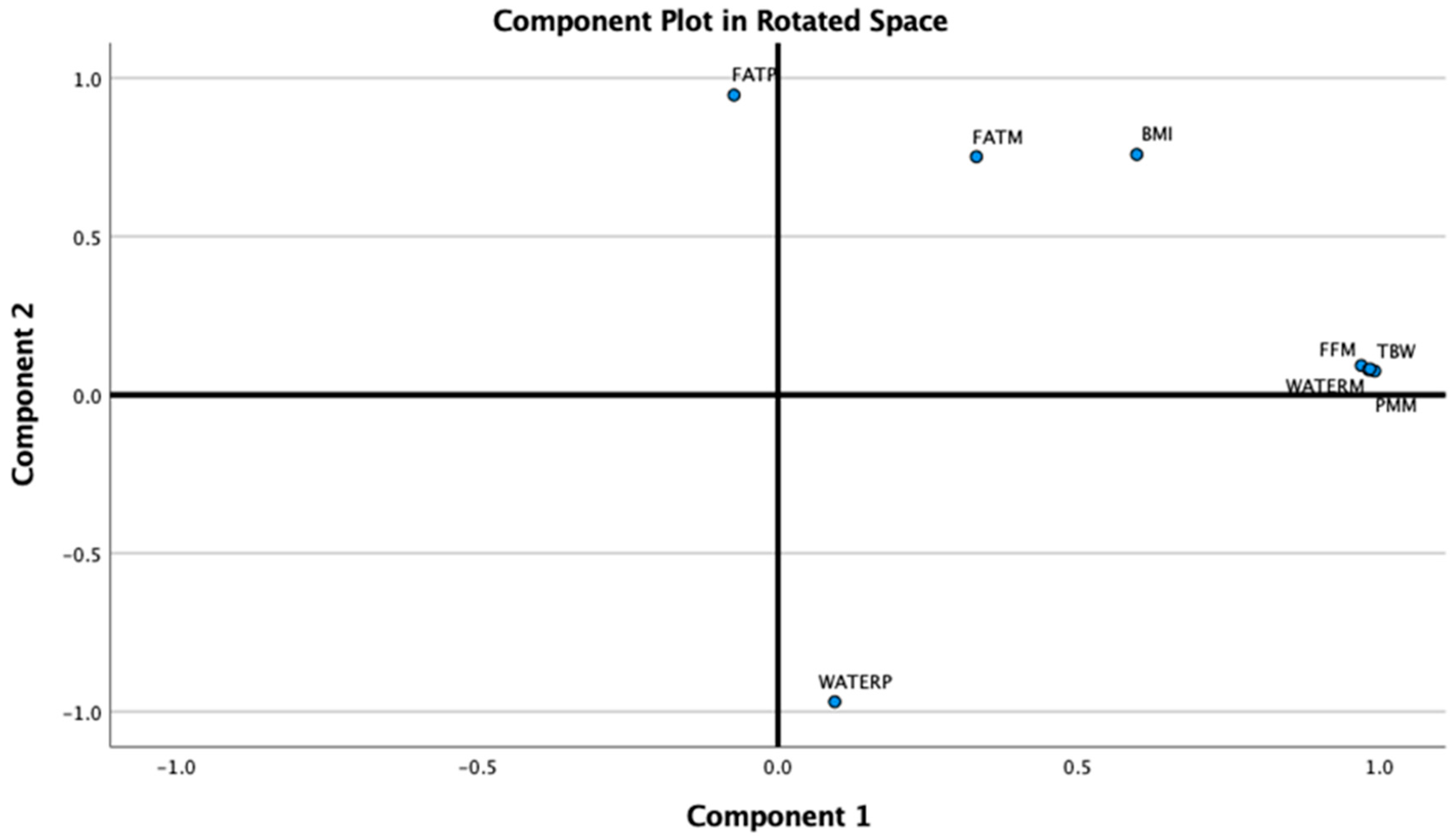 Component 1 (Fat-Free Mass), with an Eigenvalue of 4.77, accounted for 59.61% of the total variance and included TBW (Total Body Water), WATERM (Water Mass), PMM (Predicted Muscle Mass), and FFM (Fat-Free Mass).