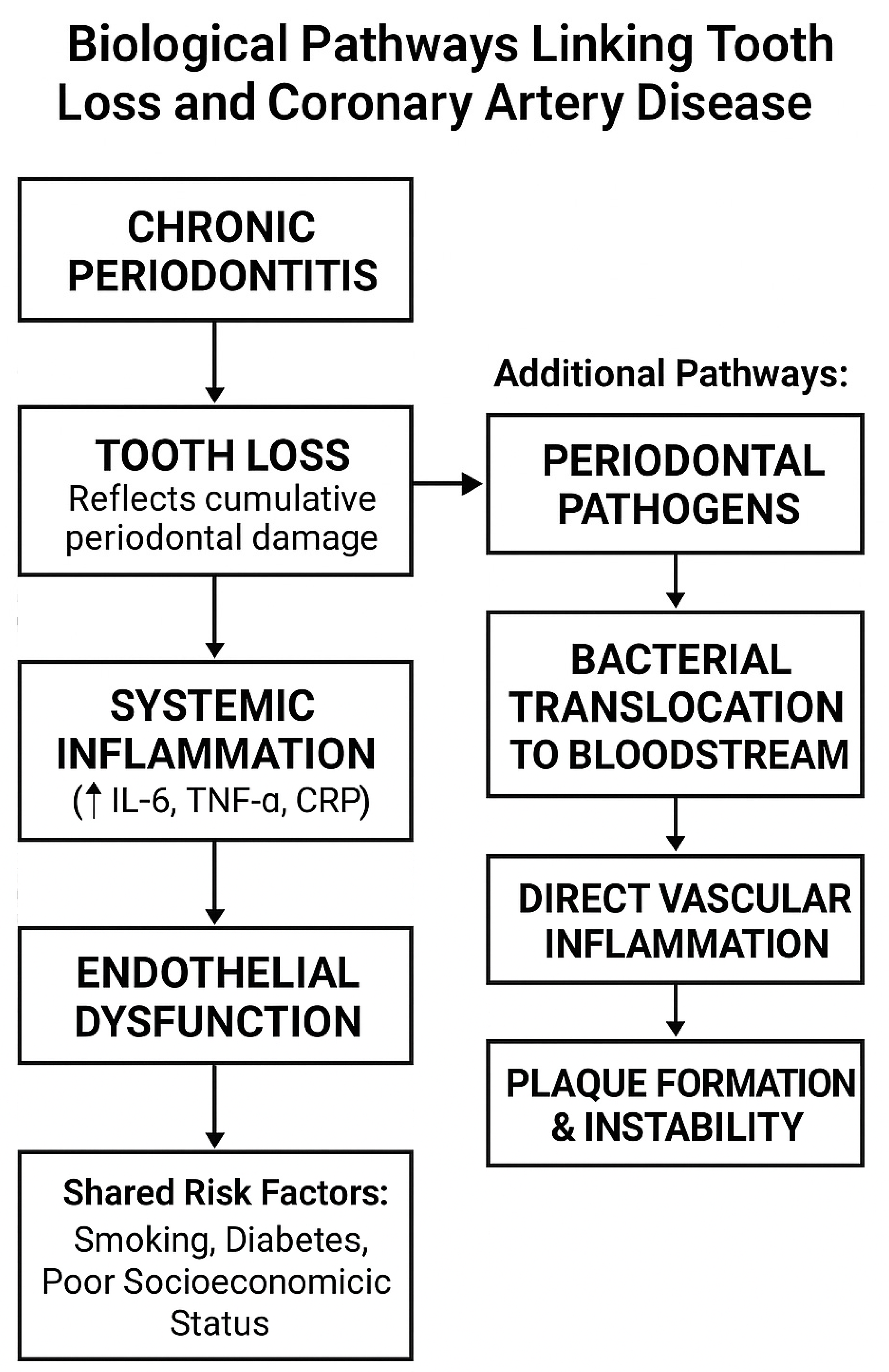 - Risk stratification: Patients with significant tooth loss, especially when unexplained by trauma or localized pathology, should be considered for enhanced cardiovascular evaluation.