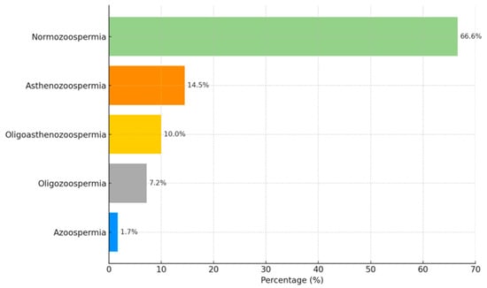 Semen analysis showed that normozoospermia was observed in the majority of cases (66.6%), while approximately one-third of men presented with pathological semen parameters. Among the abnormalities, motility and combined motility–concentration defects were predominant, with asthenozoospermia and oligoasthenozoospermia being the most frequent findings. Less common conditions included isolated oligozoospermia and azoospermia (Figure 2).
