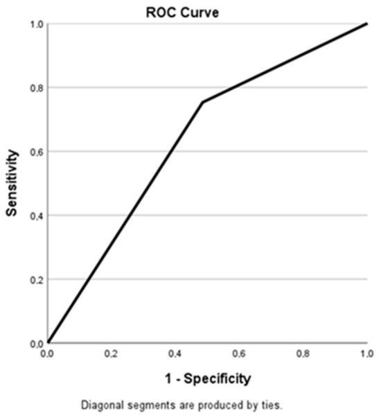 Receiver operating characteristic (ROC) curve analysis (Figure 3) yielded an area under the curve (AUC) of 0.634 (95% CI: 0.572–0.696), indicating moderate discriminatory capacity. Sensitivity was 75.3% [95% CI: 67.9–81.7], and specificity was 51.5% [41.3–61.7].