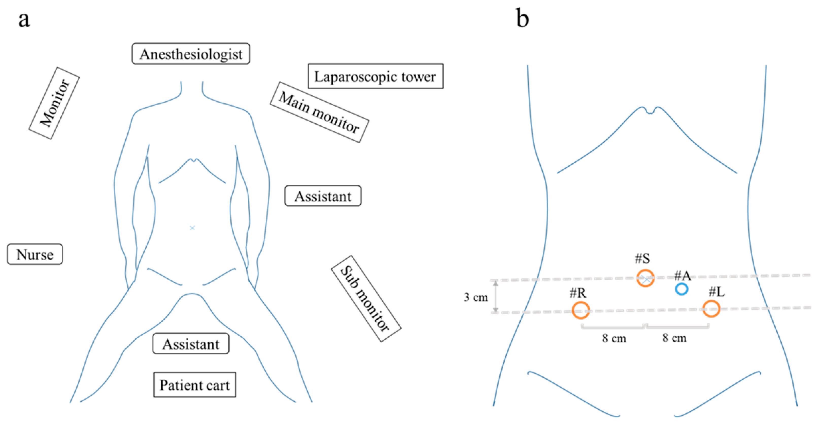 Figure 1b). A 12 mm trocar was inserted through the umbilicus, followed by the placement of two 11 mm trocars, each positioned 8 cm lateral and 3 cm caudal to the umbilical port on each side. An additional 5 mm port for the auxiliary forceps was inserted at a point midway between the umbilical and left lateral abdominal ports. A 10 mm, 30-degree oblique-view laparoscope (Olympus, Tokyo, Japan) was introduced through the umbilical port. All trocars used were ENDOPATH XCEL™ bladeless trocars (ETHICON, Johnson & Johnson, Cincinnati, OH, USA).