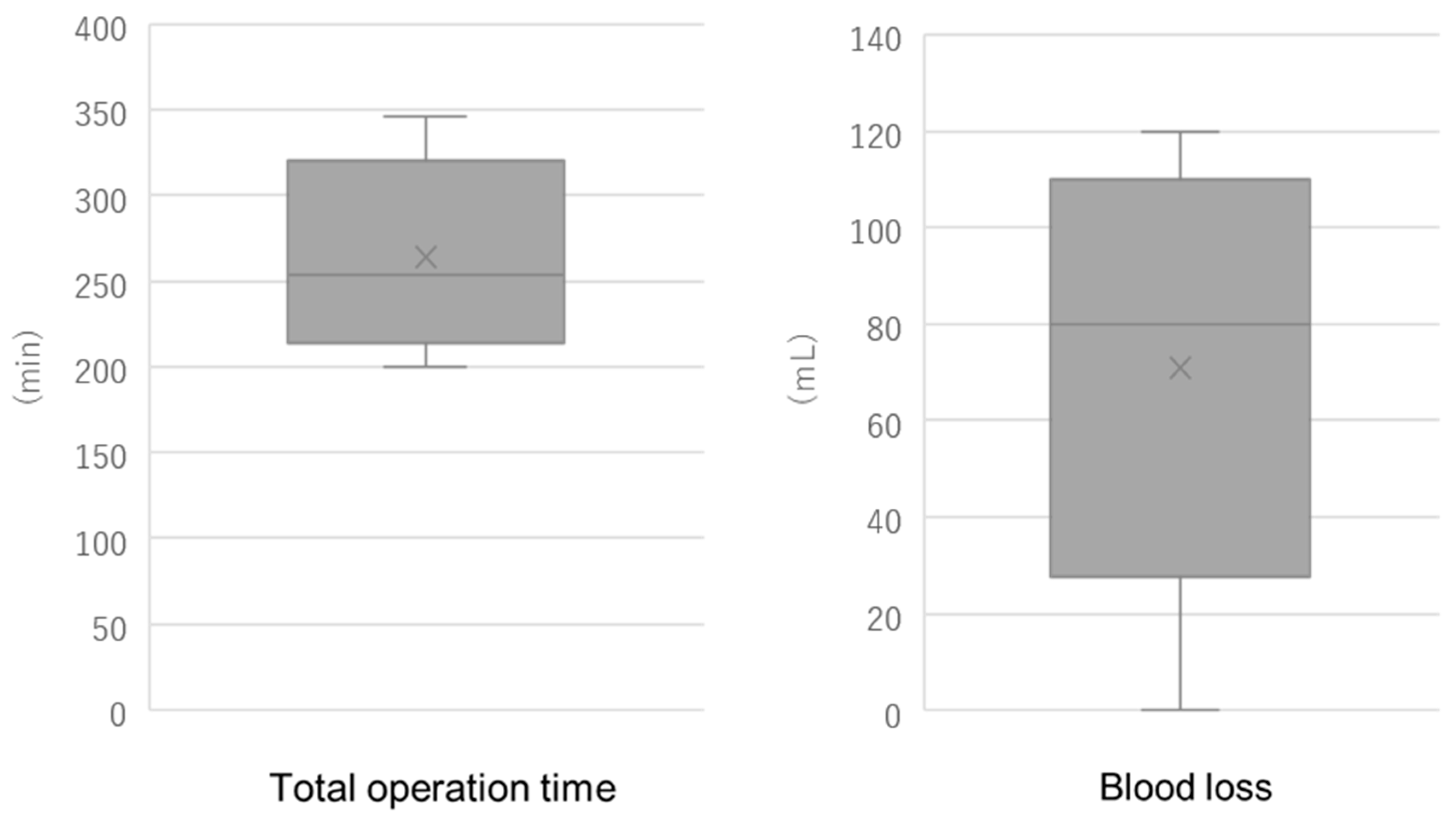 13]. For the Senhance system (Asensus Surgical, Inc., Research Triangle Park, NC, USA), the total operative time for hysterectomy cases ranged from 32 to 136 min, with a median of 57 min. The estimated blood loss ranged from 25 to 100 mL, with a median of 75 mL [