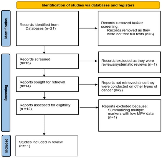 A total of 21 articles were displayed in the PubMed database, but only 15 manuscripts (71.4%) had free full text available, while 6 articles (28.6%) were excluded solely because of the lack of full-text availability. We focused on observational studies (case–control, cohort, cross-sectional) that included adult patients with thyroid nodules or confirmed thyroid cancer, comparing them with healthy controls or patients with benign thyroid disorders. From these 15 manuscripts, we removed the records that were reviews or systematic reviews (1 article) and the articles where the role of MPV was studied in other types of cancer (2 articles). We also removed a manuscript summarizing multiple markers that had low MPV data. Finally, from an initial 21 articles, only 11 met the criteria and were included in the review, as shown below in Figure 1. Of these, all the articles were on human subjects. No formal exclusion based on study quality was applied, consistent with the scoping nature of the review. We highlight that the exclusion of non-open-access studies was based on accessibility issues rather than scientific relevance and may therefore have affected the representativeness of the included evidence.