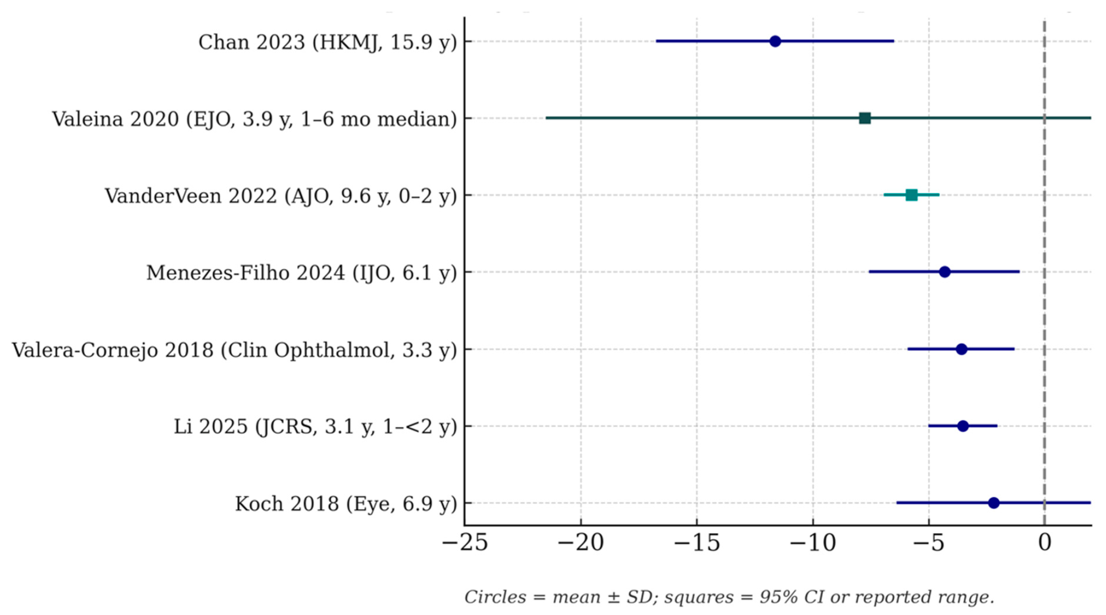 | Menezes-Filho et al., 2024 (Indian J Ophthalmol) [3] | Brazil | Cross-sectional retrospective | 81 | 7.7 months (IQR 3.7–30.5) | 6.1 years (72.9 ± 37.1 months) | Overall −4.32 D ± 3.25; by age — <6 mo −5.73 D ± 3.14, 6–24 mo −4.00 D ± 3.15, >24 mo −2.52 D ± 2.57. Greater shift in aphakic eyes (−5.57 D) vs. pseudophakic (−3.44 D). Strabismic eyes −4.99 D vs. non-strabismic −2.52 D. Eyes with surgical complications −5.87 D vs. no complications −3.75 D | Not numerically detailed; shorter AL and microphthalmia correlated with greater MS and complications | Age at surgery, bilaterality, strabismus, aphakia/pseudophakia, BCVA, surgical complications, VAO, anterior vitrectomy, microphthalmia, SG, follow-up duration | Multivariate model: younger age and surgical complications independently predicted greater MS. Strabismus, VAO, and aphakia significant only in univariate models. Concluded that early surgery and intraoperative/postoperative complications strongly increase postoperative MS |