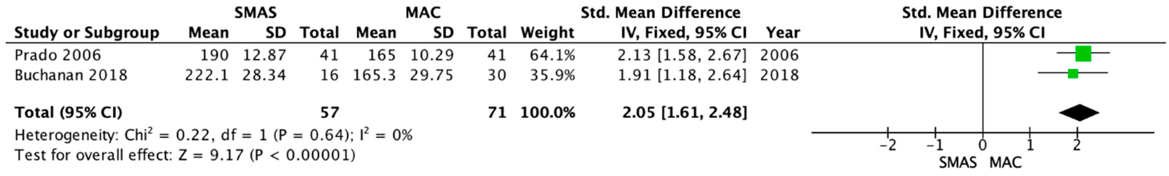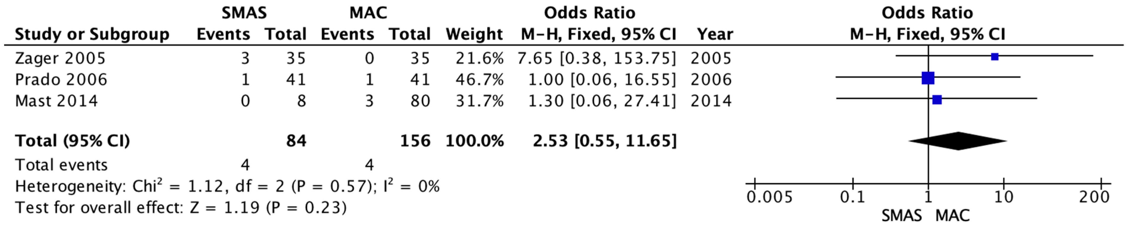Studies that lacked comparative analyses (between the SMAS technique and the MACS lift) were excluded. We analyzed the cohort characteristics, number of patients, duration of surgery, complications (e.g., facial edema, hematoma, skin laxity, pain, nerve damage), and aesthetic results as reported by pain scores and patient satisfaction metrics. The primary outcome was the overall rate of complications. Secondary outcomes included OR time (min), the rate of postoperative hematoma, and the aesthetic-pain-related variables.