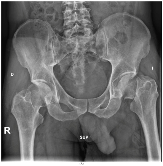 - Brooker, A.F.; Bowerman, J.W.; Robinson, R.A.; Riley, L.H. Ectopic Ossification Following Total Hip Replacement: Incidence and a Method of Classification. J. Bone Jt. Surg.—Am. Vol. 1973, 55, 1629–1632. [Google Scholar]