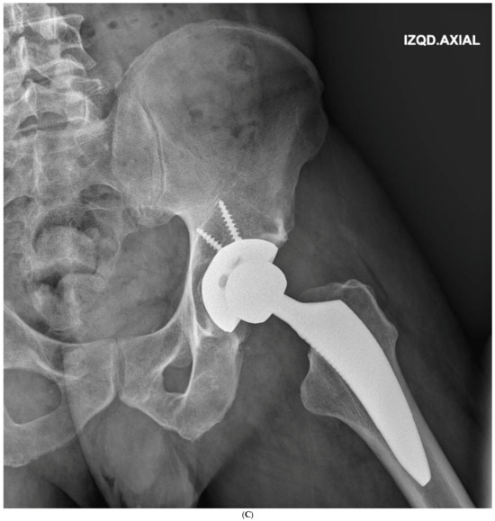 The average cup inclination and anteversion were 43° ± 3° (range, 38–50°) and 10° (range, 0–15°), respectively, in the SFS group, compared with 44° ± 5° (range, 37–50°) and 5° (range, 3–15°) in the CSS group. All acetabular components were positioned within Lewinnek’s safe zone. No radiolucent lines, cup migration, or broken screws were observed in either group throughout the follow-up period. Radiographic signs of osseointegration were present in all implants, with at least three of Moore’s criteria met in every SFS case (Figure 3A–C), indicating complete osseointegration. Similar findings were noted in the CSS group (Figure 4A–C). No femoral radiolucency or periprosthetic osteolysis was detected at any scheduled follow-up. Stem subsidence of approximately 3 mm was observed at the 3-month follow-up in two hips in the SFS group and three hips in the CSS group; however, these cases were not associated with clinical symptoms or functional impairment. No femoral stem loosening was identified during the follow-up period. A leg length discrepancy (LLD) of less than 1 cm was observed in three hips in the SFS group (average, 4 ± 3 mm) and in eight hips in the CSS group (average, 4 ± 5 mm). None of these discrepancies resulted in clinical or functional complaints, and no heterotopic ossification was identified in the radiographic evaluations (Table 4).