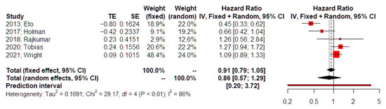 Hazards ratio of overall survival. Forest plot analysis: Vertical line = “no difference” point between the two groups. Red squares = hazard ratios of included studies; Horizontal black lines = 95% CI of included studies; Diamond = pooled hazard ratios retrieved from the outcomes of the meta-analysis and 95% CI for all studies; Horizontal red line = prediction intervals. The weight of included studies is depicted for fixed and random effects model separately [15,16,17,18,19].