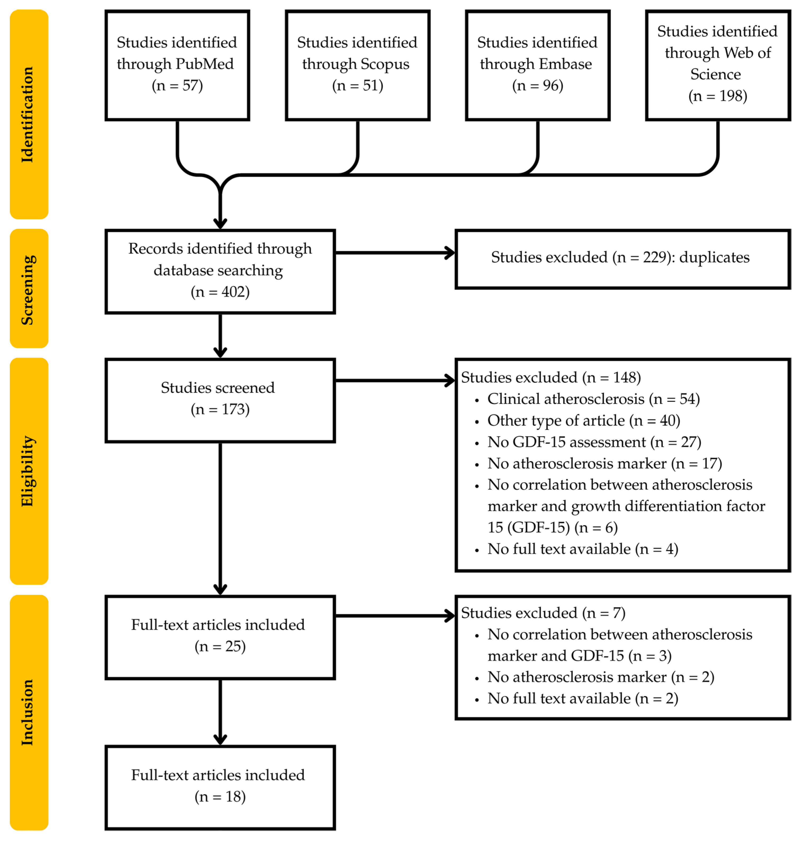 APA StyleAlexa, R.-E., Ceasovschih, A., Morărașu, B. C., Asaftei, A., Constantin, M., Diaconu, A.-D., Balta, A., Haliga, R. E., Șorodoc, V., & Șorodoc, L. (2026). Growth Differentiation Factor 15 as a Link Between Obesity, Subclinical Atherosclerosis, and Heart Failure: A Systematic Review. Medicina, 62(1), 132. https://doi.org/10.3390/medicina62010132