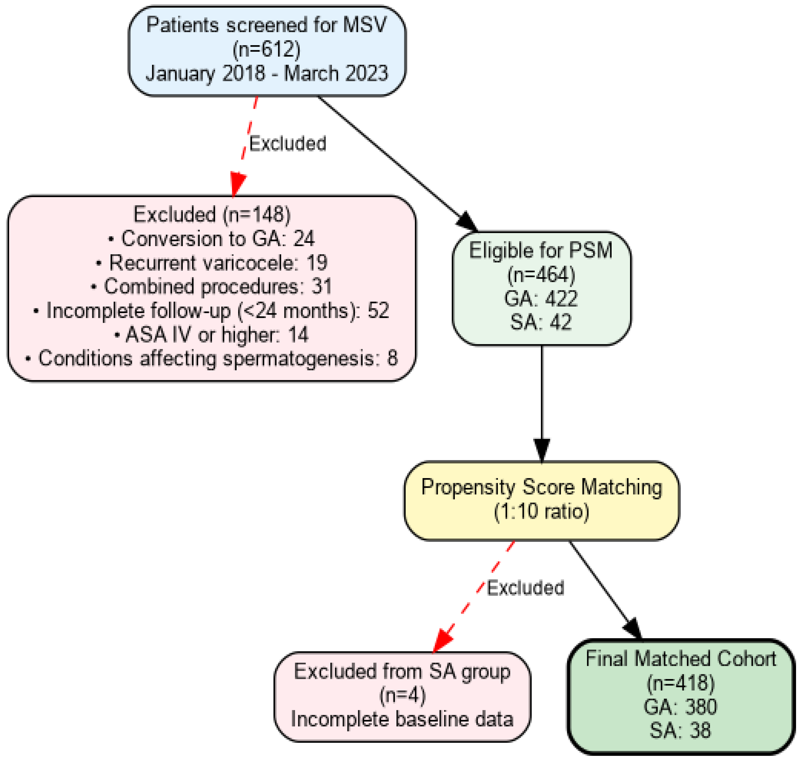 - Wang, X.; Pan, C.; Li, J.; Zhan, Y.; Liu, G.; Bai, S.; Chai, J.; Shan, L. Prospective comparison of local anesthesia with general or spinal anesthesia in patients treated with microscopic varicocelectomy. J. Clin. Med. 2022, 11, 6397. [Google Scholar] [CrossRef]