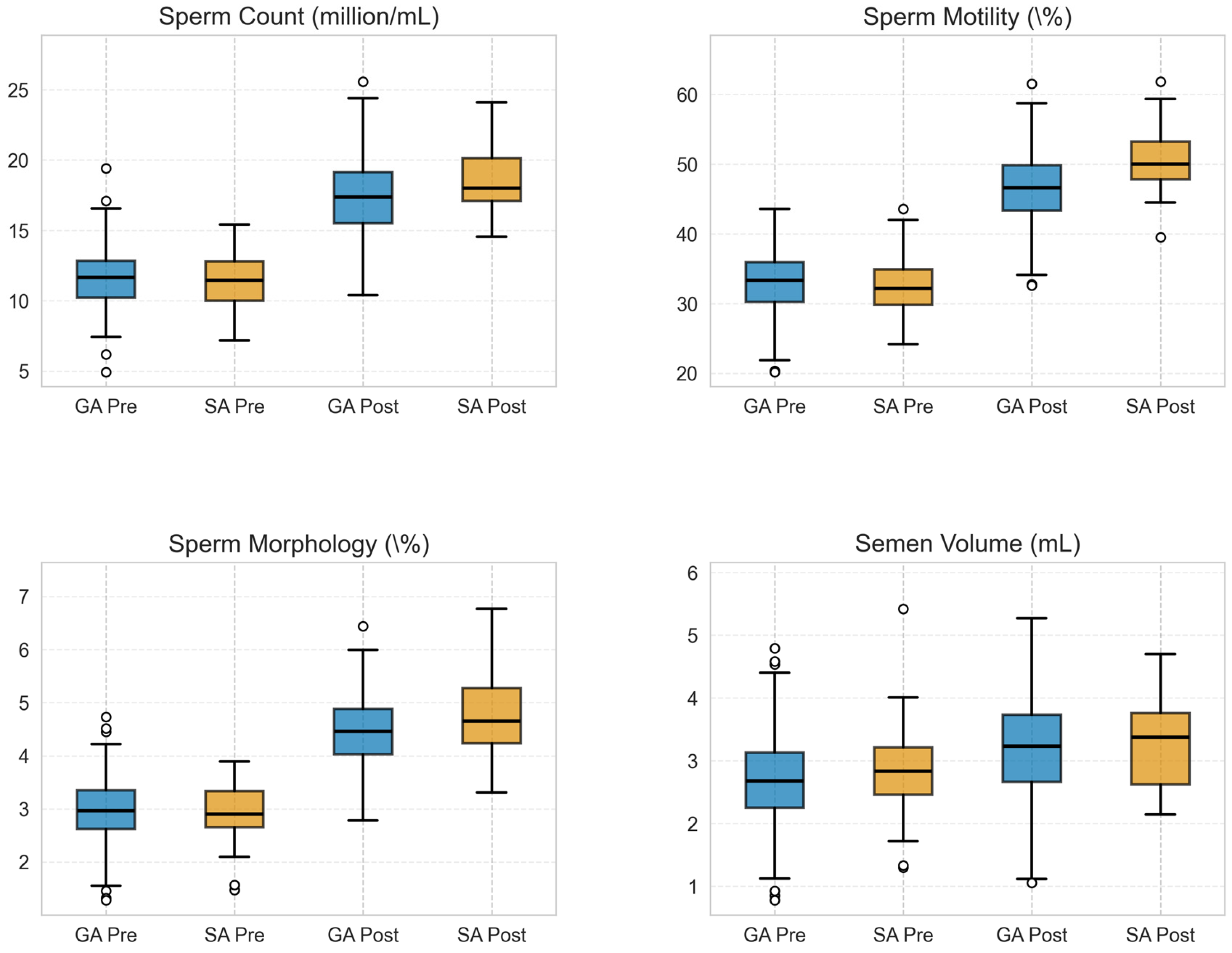 | Semen Volume | 17.77 ± 32.45 | 16.19 ± 31.87 | −1.58 (−16.52 to 8.94) | 0.553 |