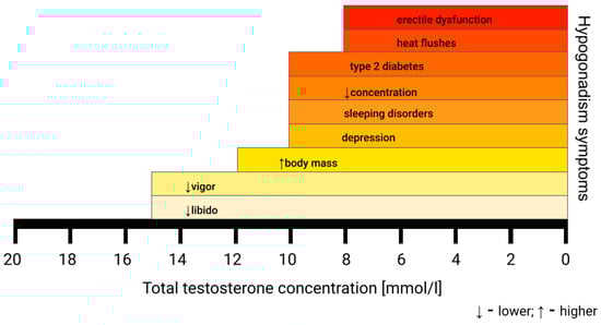 The term “hypogonadism”, according to the European Association of Urology, means a low level of serum testosterone, negatively influencing quality of life and organ functions, which is a combined clinical and biochemical syndrome. Although the number of men diagnosed with hypogonadism is growing, it still remains underdiagnosed. Hypogonadism can be caused by multiple underlying conditions, which can be classified as genetic (Klinefelter syndrome, Kallmann syndrome), endocrinological (pituitary, thyroid or testicular disorders), metabolic (obesity, diabetes mellitus), inflammatory (chronic inflammatory bowel diseases, chronic obstructive pulmonary disease, rheumatoid arthritis), psychiatric (depression, anorexia nervosa) and other (hemochromatosis, vitamin D deficiency, HIV infection). It can also be of iatrogenic (radiotherapy, pharmacotherapy of glucocorticoids, opioids, or antipsychotic drugs) or iatrogenic background. Late-onset hypogonadism (LOH) is caused by irreversible hypothalamic–pituitary–gonadal axis impairment [4]. It results in a gradual reduction in testosterone levels, approximately at a rate of 1–2% per year, causing symptoms suggestive of androgen deficiency, affecting 20% men over 60 years and 50% over 80 years [3,5]. Patients may complain not only of sexual-related symptoms, such as low libido and erectile dysfunction, but also of non-sexual ones [4]. These are non-specific and encompass, i.a., tiredness, cognitive impairment, reduced muscle strength, depression, anemia, obesity, body hair loss, hot flushes, sleep disorders, diabetes, sarcopenia, osteopenia, or osteoporosis [3,4,6]. The severity of symptoms is dependent on the total testosterone level, as presented in Figure 1. It seems that hypogonadism and its comorbidities are closely tied, creating a relationship resembling a vicious circle.