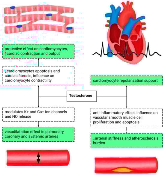 A reduced testosterone level serves as an independent risk marker for heart failure (HF) and worse outcomes in patients of both sexes. Male patients with HF and low testosterone levels are at a higher risk of decreased exercise capacity and unfavorable prognosis. In a meta-analysis by Mustafa et al., testosterone supplementation in moderate to severe HF was associated with an increased 6 min walk test (6MWT) distance by approximately 54 m, which is a better result than that achieved by standard HF pharmacotherapy and cardiac resynchronization therapy. Moreover, the peak VO2 increase observed in patients with testosterone supplementation was higher than that observed in cardiac resynchronization therapy trials. The improved exercise capacity had a complex pathophysiological background, potentially encompassing peripheral vasodilatation, muscle mass increase, anti-inflammatory effect, and hemoglobin rise. The phenomenon was observed during treatment lasting from 12 to 52 weeks [22].