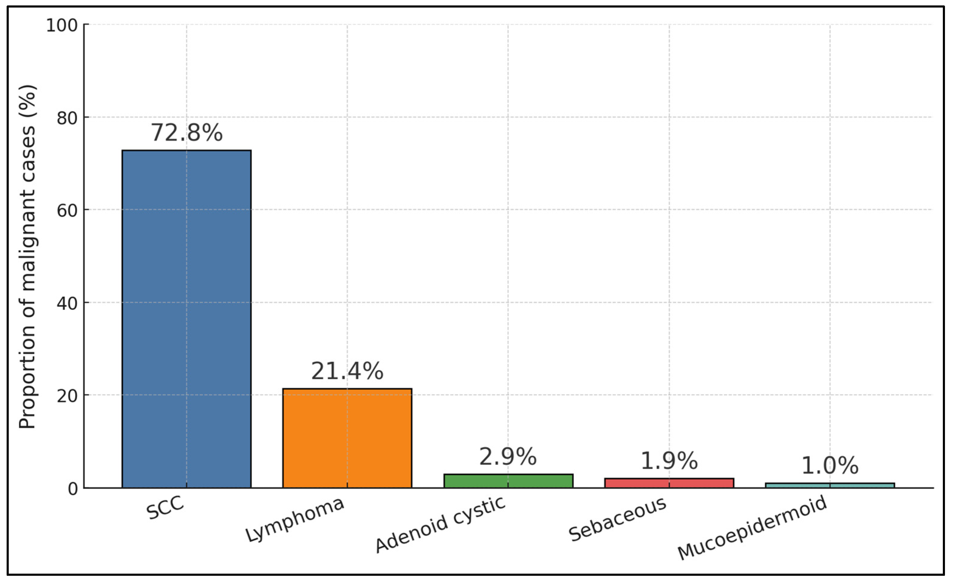 Pooled across modern tumor-enriched datasets, SCC comprised ~72.8% of malignancies (75/103), lymphoma ~21.4% (22/103), with adenoid cystic ~2.9% (3/103), sebaceous ~1.9% (2/103), and MEC ~1.0% (1/103), reflecting an epithelial-dominant profile with a meaningful lymphoma minority [29,34,35,36]. Clinically, this split supports two parallel care pathways: oncologic resection plus adjuvant RT/CRT for SCC-predominant disease (often via combined ophthalmology–endoscopic ENT approaches), and hematologic staging with RT/chemo for lacrimal sac lymphomas—both optimized within joint ENT–ophthalmology workflows [29,34,35,36], as presented in Figure 2.