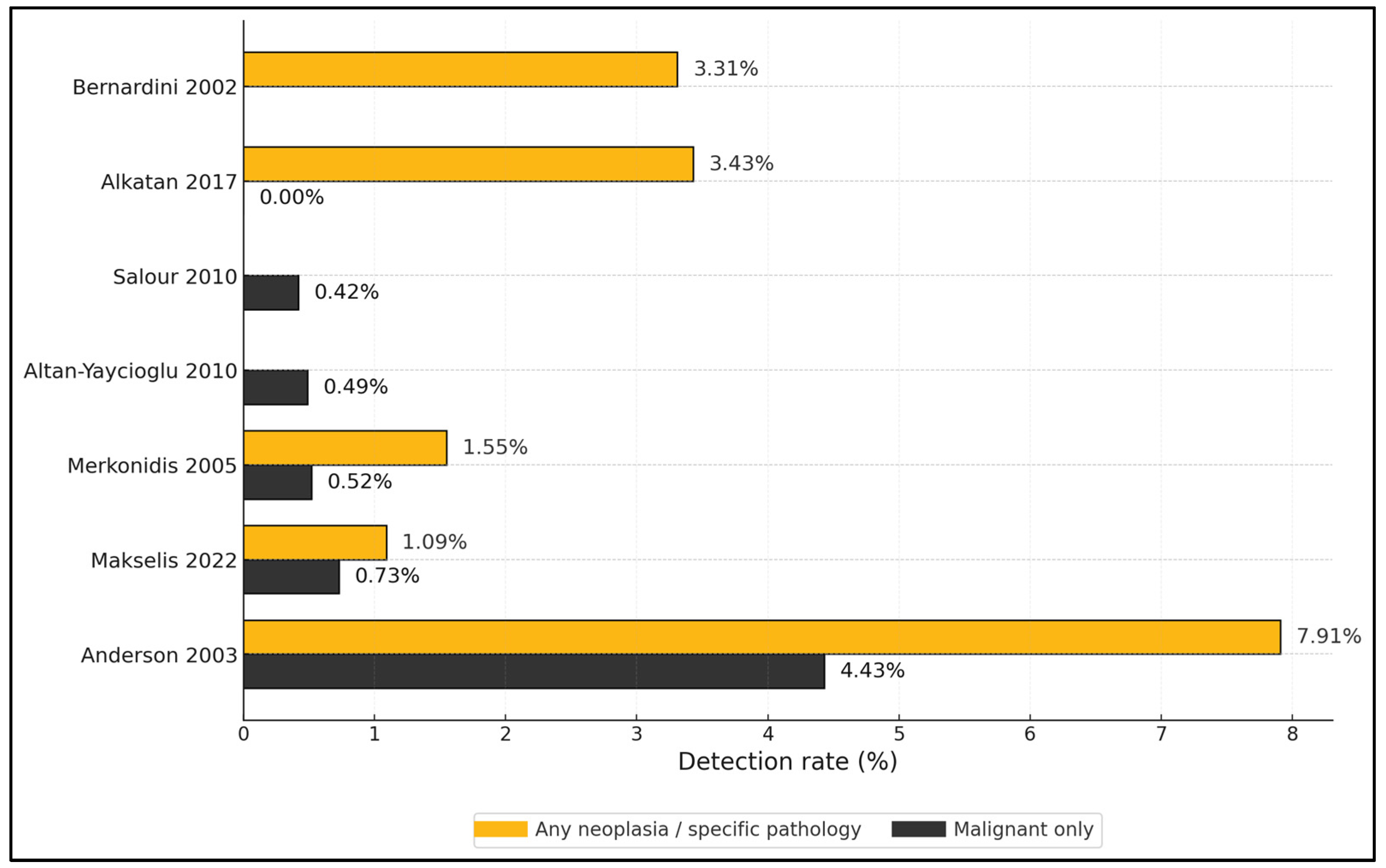 Heterogeneity in study designs, denominators, and pathology reporting constrained quantitative synthesis; notably, “significant pathology” variably bundled neoplasia with inflammatory/systemic entities. Staging was inconsistently defined (often using Summary Stage rather than a TNM equivalent), impeding stage-matched comparisons. Imaging protocols differed across centers (CT kernel, MRI sequences, slice thickness), limiting pooled diagnostic accuracy estimates. Many routine DCR series lacked granular outcomes (nodal status, margin control, toxicity), and several tumor-enriched cohorts were small, single-institution, and retrospective, introducing selection and referral biases. Finally, time-to-diagnosis metrics and red-flag definitions were non-standardized, which may over- or underestimate the yield of selective biopsy.
