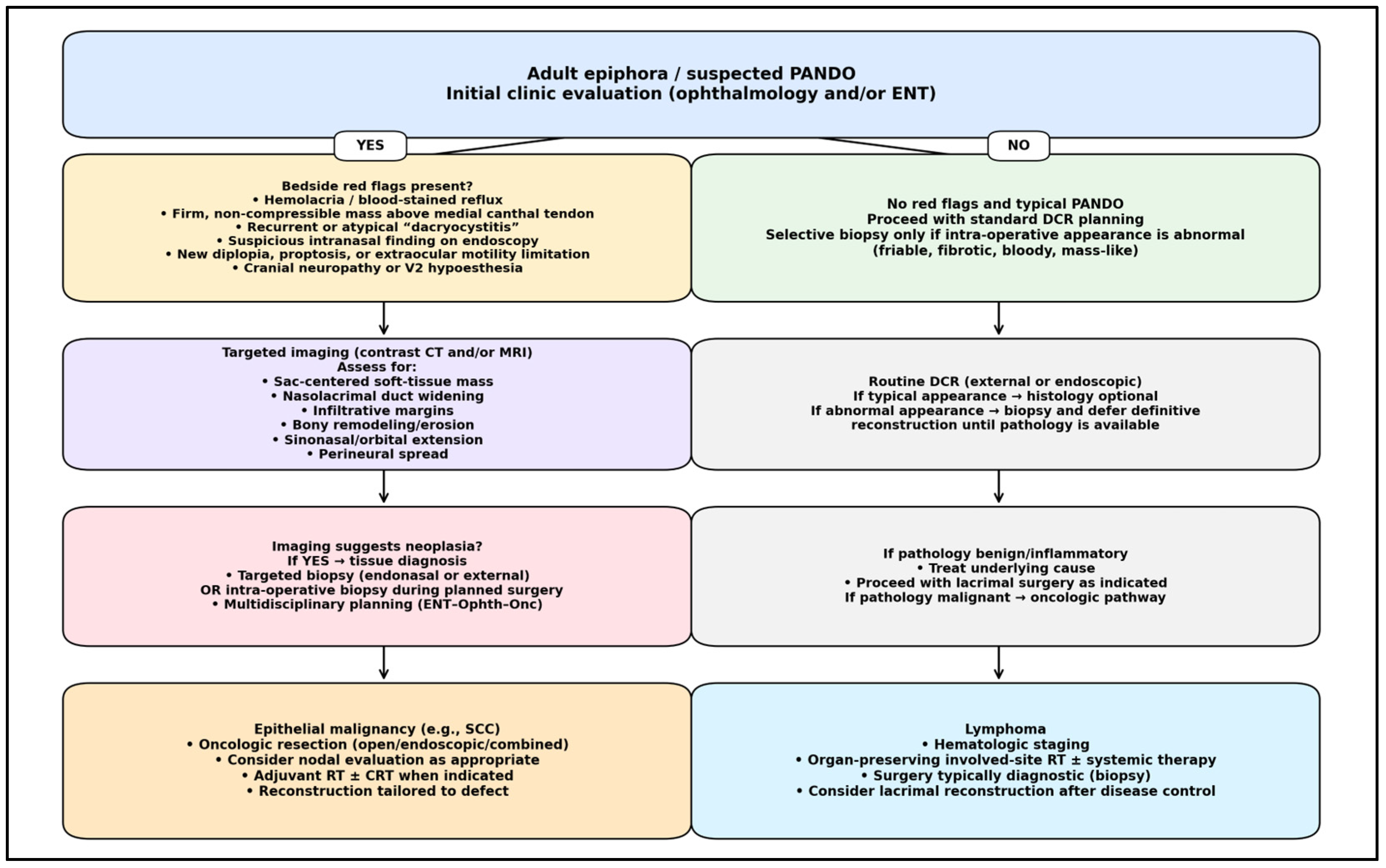 Figure 4 summarizes the core synthesis of this review: most typical PANDO presentations can proceed with standard dacryocystorhinostomy, whereas a defined set of bedside red flags should trigger targeted cross-sectional imaging and selective tissue diagnosis. This tiered approach operationalizes how radiologic indicators of neoplasia (infiltrative sac-centered mass, nasolacrimal duct widening with bony change, and extension patterns) shift care from routine lacrimal surgery to an oncologic pathway, with histology determining epithelial versus lymphoma-specific treatment.