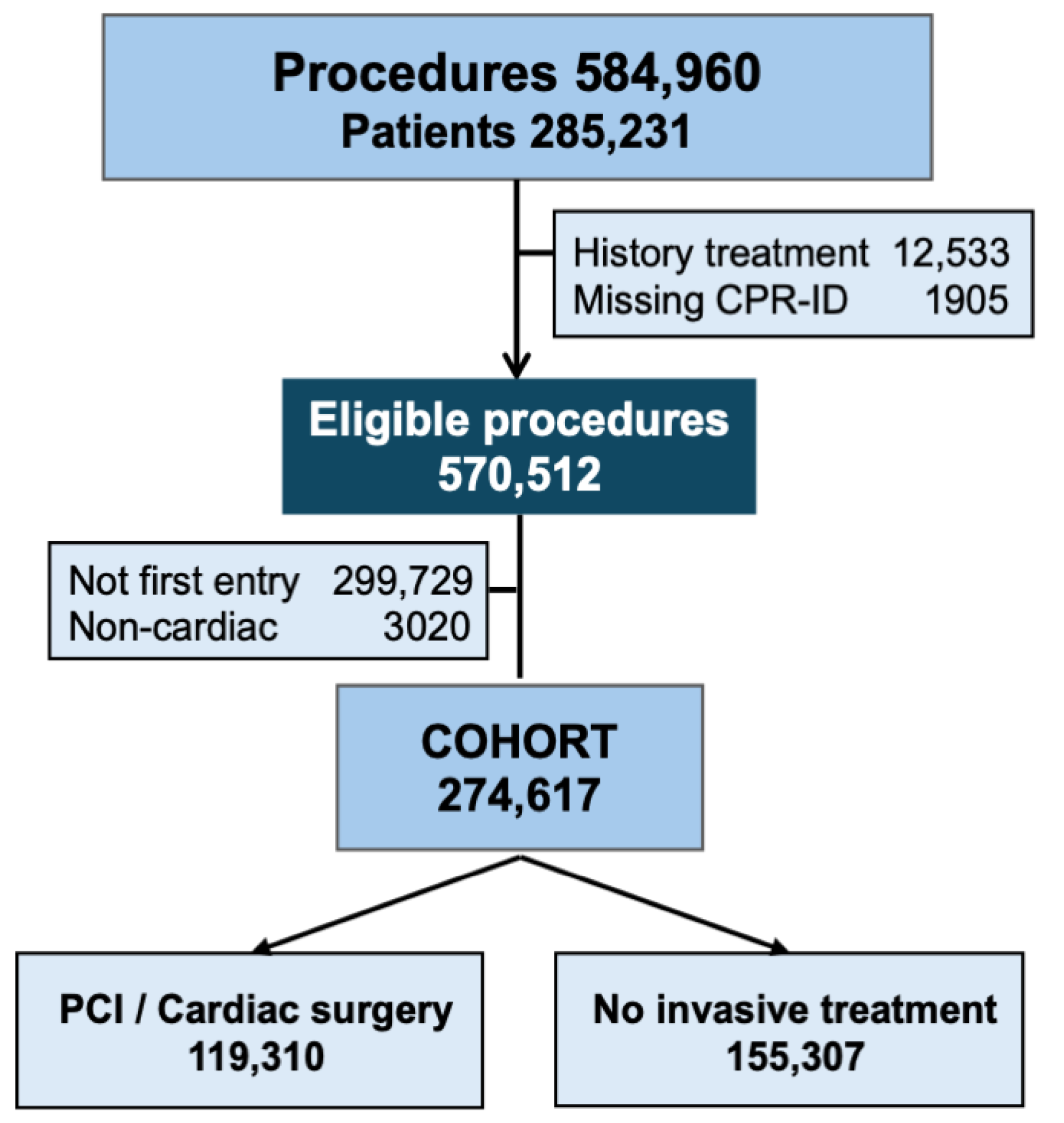 - Schmidt, M.; Maeng, M.; Madsen, M.; Sørensen, H.T.; Jensen, L.O.; Jakobsen, C.-J. The Western Denmark Heart Registry: Its Influence on Cardiovascular Patient Care. J. Am. Coll. Cardiol. 2018, 71, 1259–1272. [Google Scholar] [CrossRef] [PubMed]