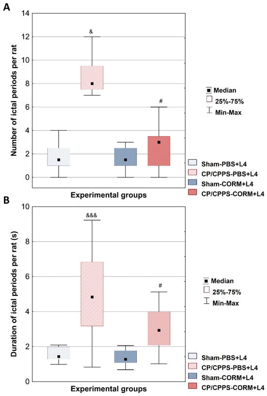 Similar results were found in the analysis of EEG ictal period duration. The duration was significantly longer in the CP/CPPS-PBS group compared to Sham-PBS (p < 0.001, Figure 4B). Postoperative treatment with the CORM-A1 significantly reduced ictal period duration in CP/CPPS animals (CP/CPPS-CORM vs. CP/CPPS-PBS, p = 0.0203, Figure 4B).