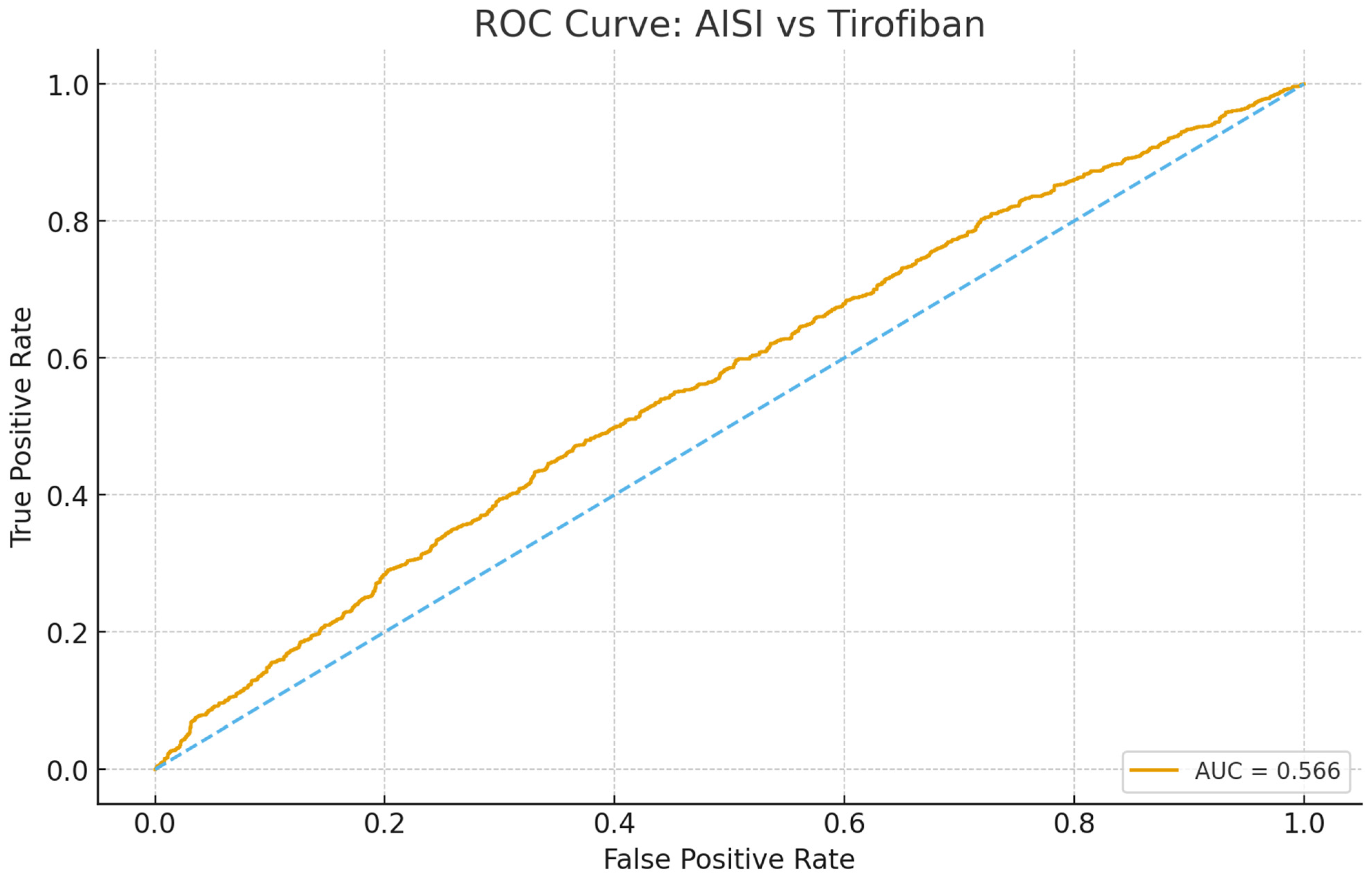 ROC curve analysis demonstrated that AISI exhibited a modest but statistically significant discriminatory ability for predicting the need for tirofiban during primary PCI (AUC = 0.566, 95% CI: 0.536–0.596;
