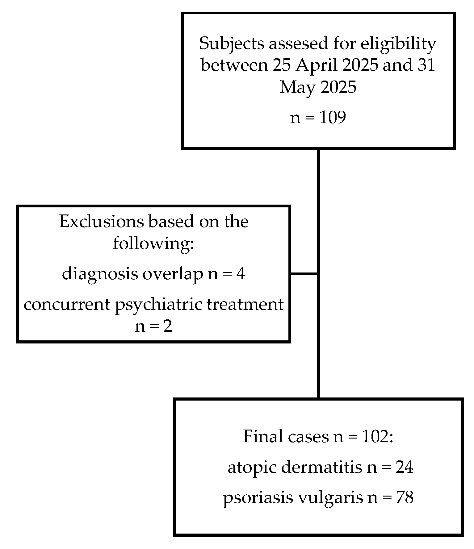 Despite limitations, the key strength of our study was the analysis of actual clinical data from routine dermatology practice, which provides insight into the psychological burden of patients who receive care in clinical settings. In addition, another strength is the use of validated and widely accepted instruments for disease severity (BSA, PASI, EASI, DLQI) and psychological screening (PHQ-9 and GAD-7). Lastly, the combined assessment of atopic dermatitis’s and psoriasis vulgaris’s objective and subjective severity, as well as mental health outcomes, allows a more comprehensive evaluation of patient burden.