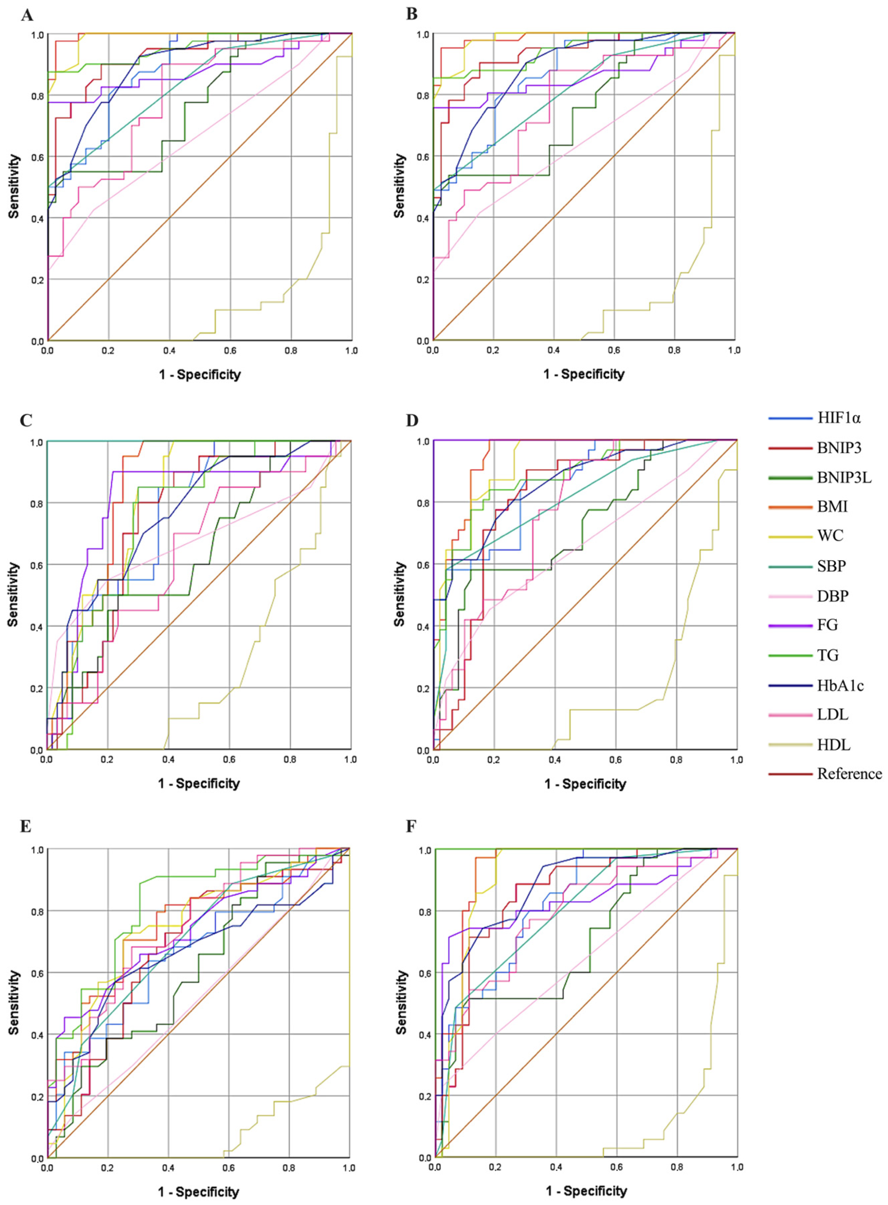25]. Our study demonstrates a significant upregulation of BNIP3L expression in MetS patients compared to healthy controls, reinforcing its role in mitophagy regulation and metabolic dysfunction. BNIP3L, a key mitochondrial stress sensor, has been previously implicated in hypoxia-induced autophagy, mitochondrial clearance, and cellular adaptation to metabolic stress. The observed increase in BNIP3L levels in MetS patients suggests an adaptive response to mitochondrial dysfunction, which is a hallmark of insulin resistance and obesity-related metabolic dysregulation. The ROC analysis indicated a moderate discriminatory performance of BNIP3L in distinguishing MetS patients from controls (AUC: 0.77). Similar moderate performance was observed in the abdominal obesity model (AUC: 0.754), supporting an association between BNIP3L levels and obesity-related metabolic stress. Subgroup ROC analyses showed weaker discriminatory performance for blood pressure (AUC: 0.631) and FG (AUC: 0.72), and these findings should be interpreted cautiously given the limited sample size. In addition, BNIP3L exhibited mild associations with triglyceride (AUC: 0.699) and HDL levels (AUC: 0.612), indicating limited discriminatory ability for lipid-related parameters. Collectively, these results suggest that circulating BNIP3L is modestly associated with metabolic features of MetS and may reflect systemic metabolic stress rather than robust predictive capacity. Further validation in larger cohorts is warranted. Additionally, our study highlights the potential link between BNIP3- and BNIP3L-associated hypoxia-responsive mitochondrial stress pathways and systemic metabolic inflammation in MetS, further reinforcing the role of HIF1α in this process. BNIP3 and BNIP3L have been shown to regulate mitochondrial turnover in response to oxidative stress, and their excessive activation may lead to pro-inflammatory signaling, thereby exacerbating chronic low-grade inflammation, a hallmark of MetS. Our findings indicate significantly elevated systemic inflammatory markers, including CRP, and leukocyte count in MetS patients, consistent with an inflammatory metabolic state.