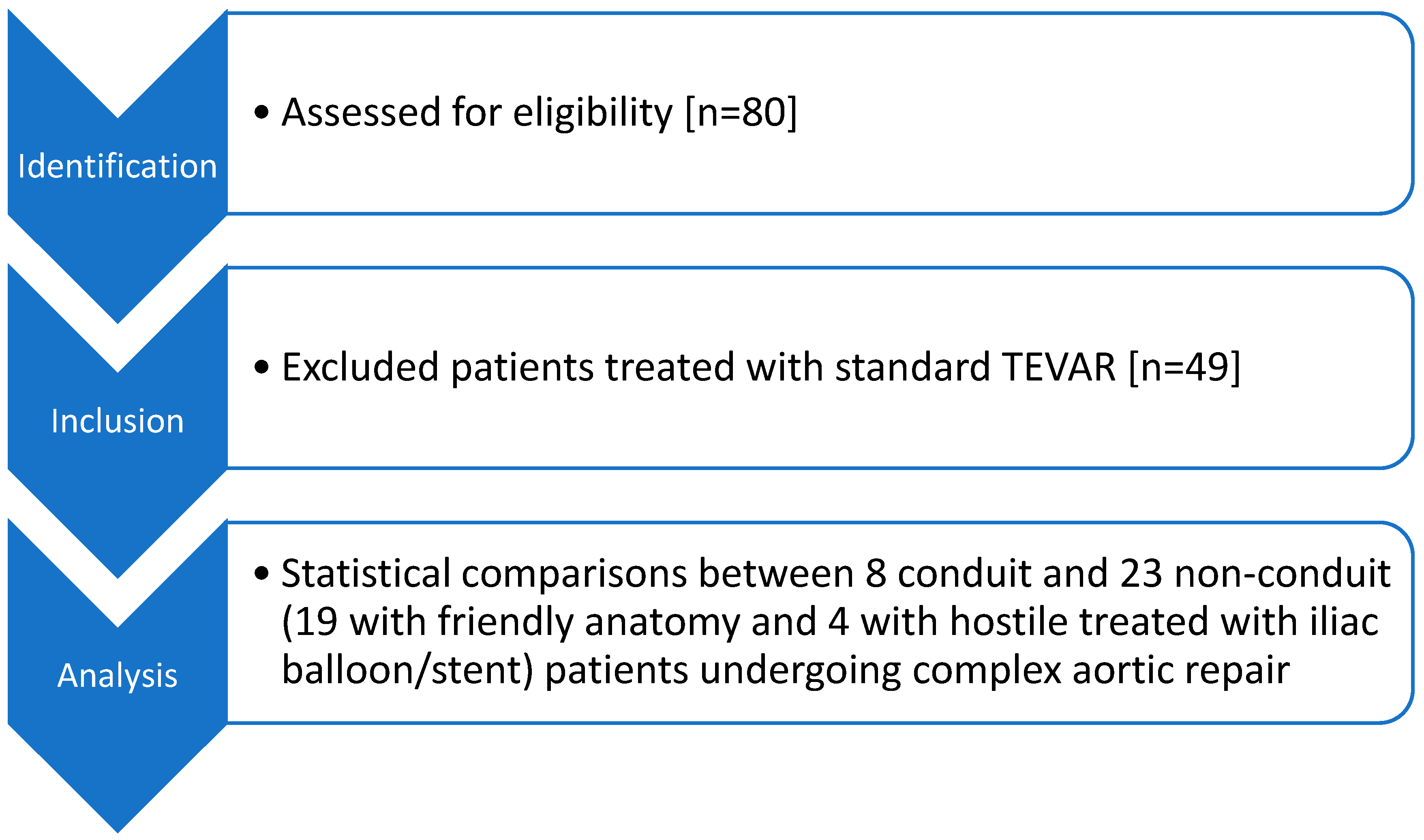 - Dias-Neto, M.; Marcondes, G.; Tenorio, E.R.; Barbosa Lima, G.B.; Baghbani-Oskouei, A.; Vacirca, A.; Mendes, B.C.; Saqib, N.; Mirza, A.K.; Oderich, G.S. Outcomes of iliofemoral conduits during fenestrated-branched endovascular repair of complex abdominal and thoracoabdominal aortic aneurysms. J. Vasc. Surg. 2023, 77, 712–721. [Google Scholar] [CrossRef] [PubMed]