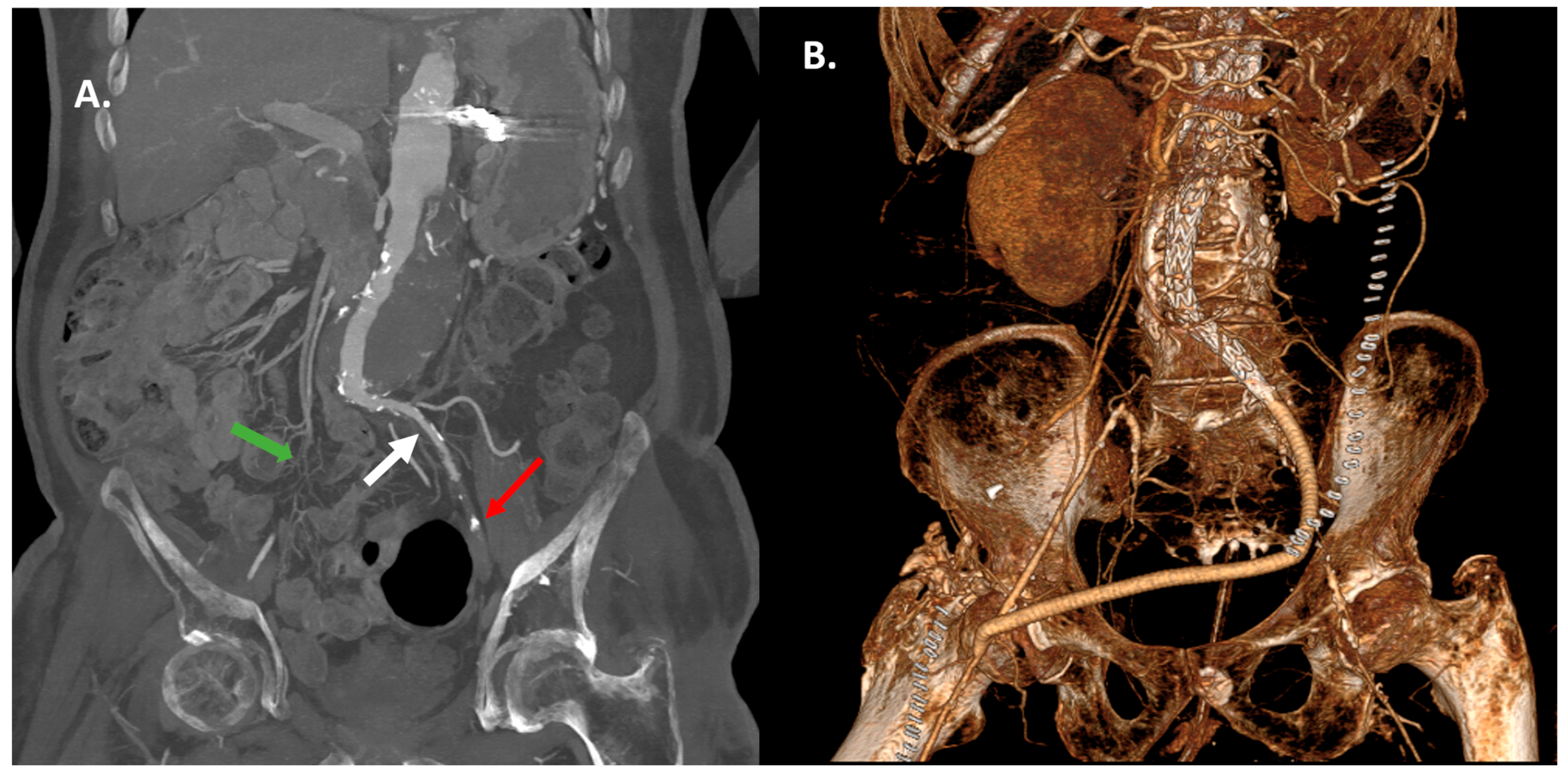 - Rowse, J.W.; Morrow, K.; Bena, J.F.; Eagleton, M.J.; Parodi, F.E.; Smolock, C.J. Iliac conduits remain safe in complex endovascular aortic repair. J. Vasc. Surg. 2019, 70, 424–431. [Google Scholar] [CrossRef] [PubMed]