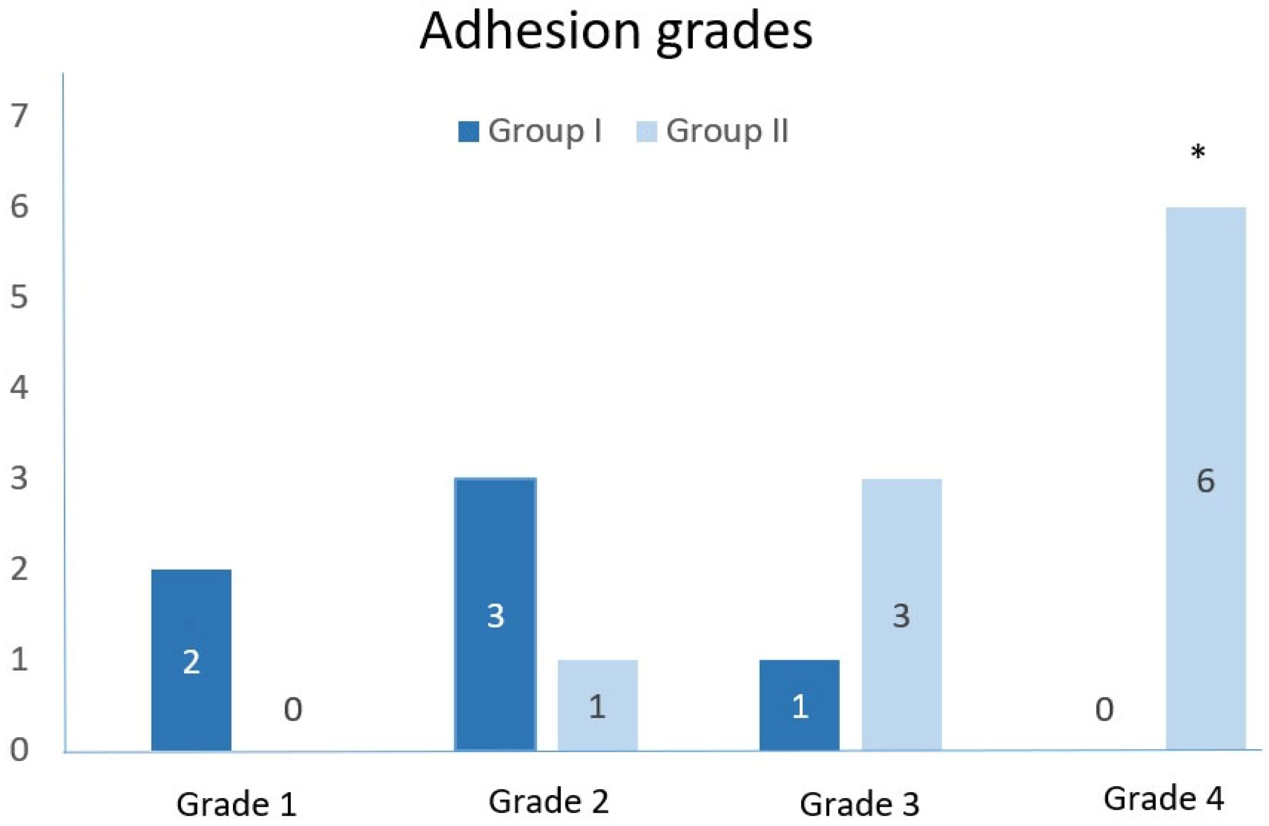 - Grade 2: Moderately dense, scattered adhesions that are easily separated.