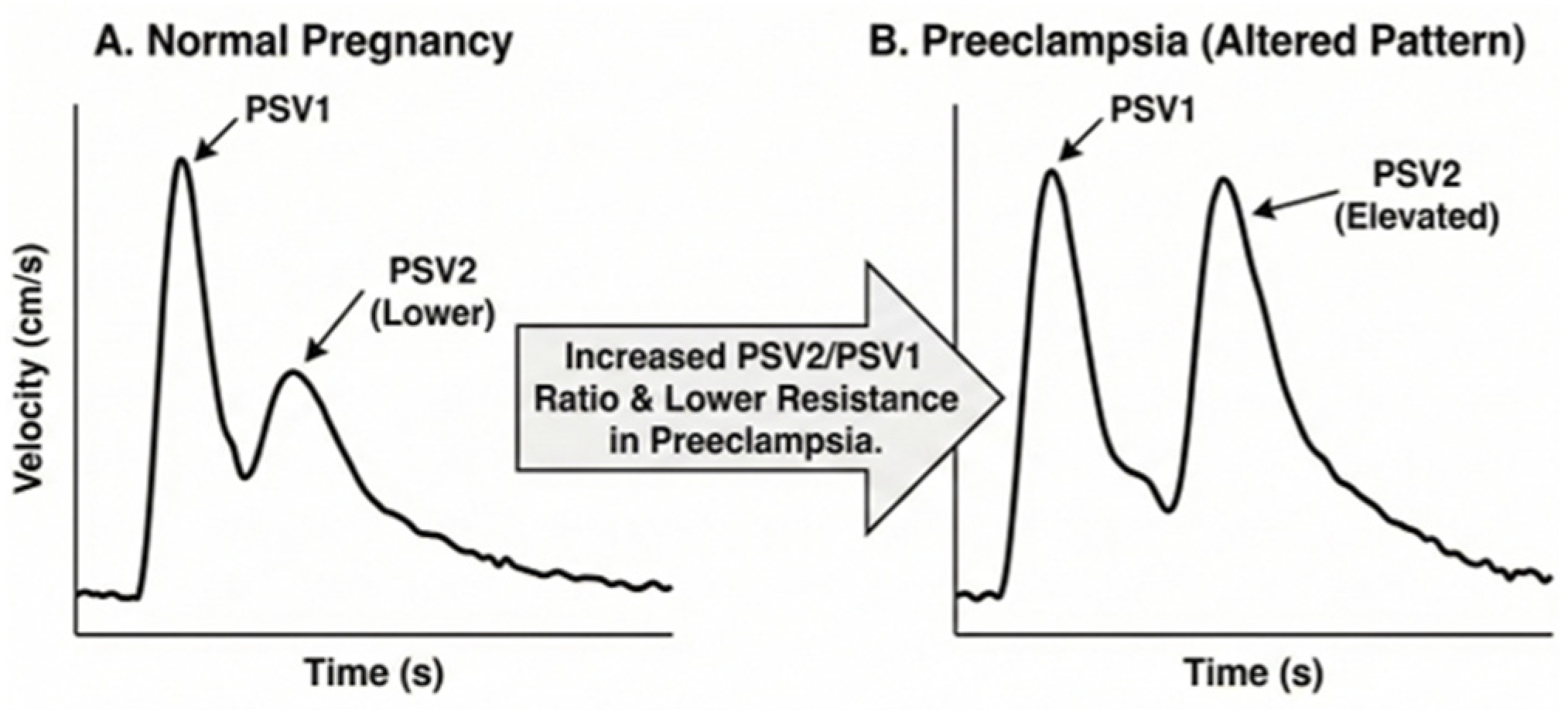 | PSV Ratio (P2/P1) | Low (P2 is significantly lower than P1; ratio typically < 0.6) | Elevated (P2 approaches or exceeds P1; ratio often > 0.65–0.75, depending on gestational age) | The elevation of the second peak (P2) signifies a loss of normal vascular tone and autoregulation, leading to a “high-flow” state. |