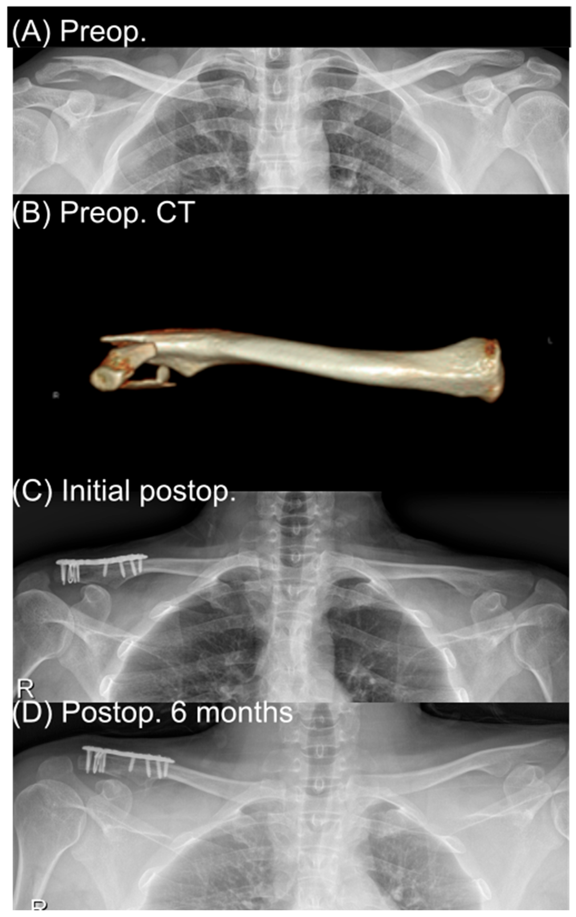 In our institutional algorithm, distal locking plates were favored when the lateral fragment was sufficiently large to accept at least four distal locking screws, typically corresponding to a fragment length ≥ 2.5 cm from the lateral edge of the clavicle. When the distal fragment was shorter than this threshold or was markedly comminuted—conditions under which anatomical plates cannot provide effective screw fixation, especially in osteoporotic bone—supplemental cerclage around the clavicle and coracoid was added to enhance vertical stability. Traditional hook plates were reserved for cases in which the distal fragment was extremely small, comminuted, or otherwise unsuitable for plate-based fixation despite augmentation (