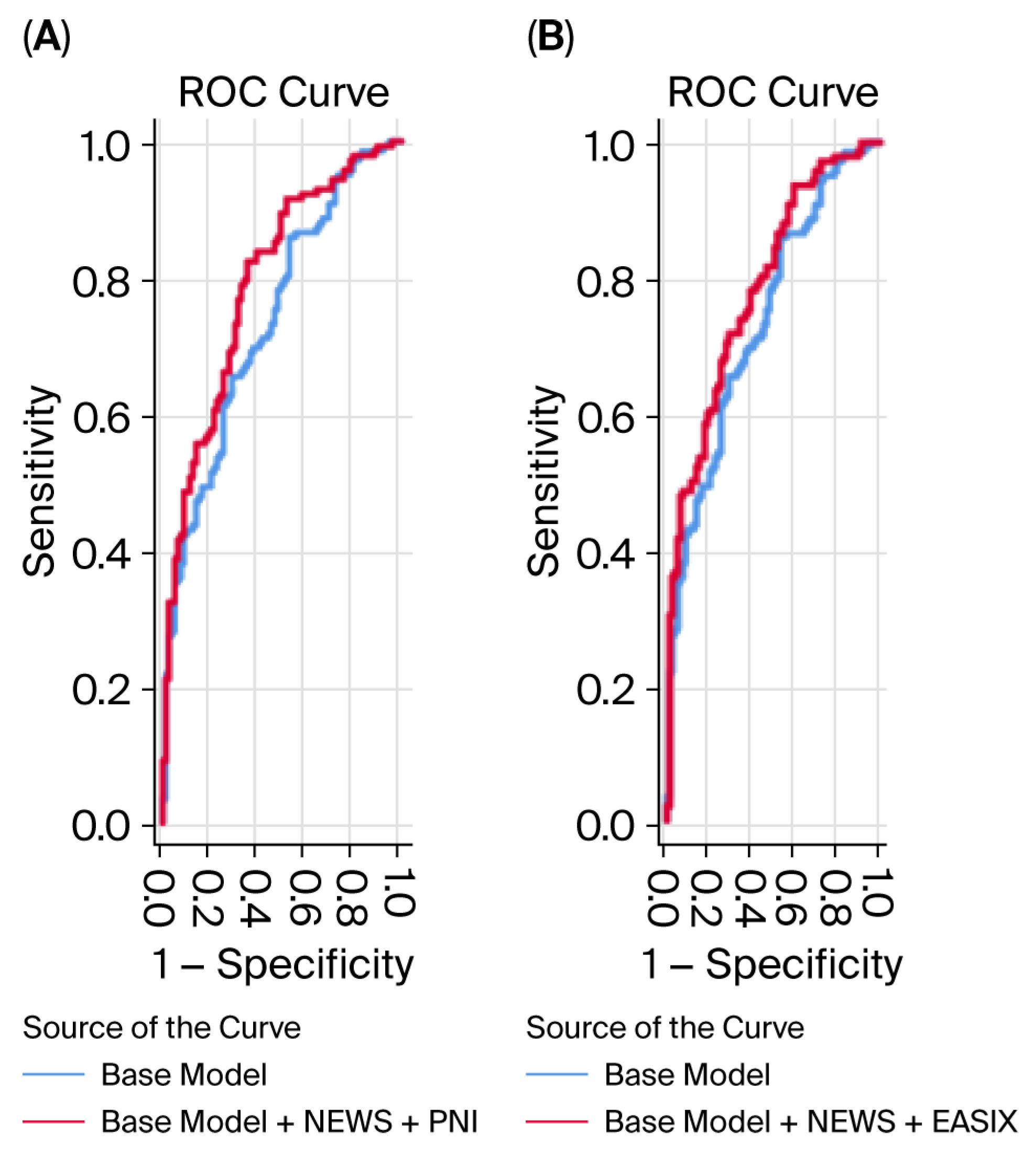 The discriminative performance of NEWS, PNI, and EASIX, both individually and in combination, was evaluated using receiver operating characteristic (ROC) curve analysis. The area under the ROC curve (AUC) was calculated to assess predictive accuracy, and comparisons between AUCs were performed using the DeLong test. A two-sided p-value < 0.05 was considered statistically significant. For the interaction analysis, optimal cutoffs for NEWS, PNI, and EASIX were determined using the Youden Index to maximize predictive performance. The multivariate models were adjusted for age, sex, and comorbidity.