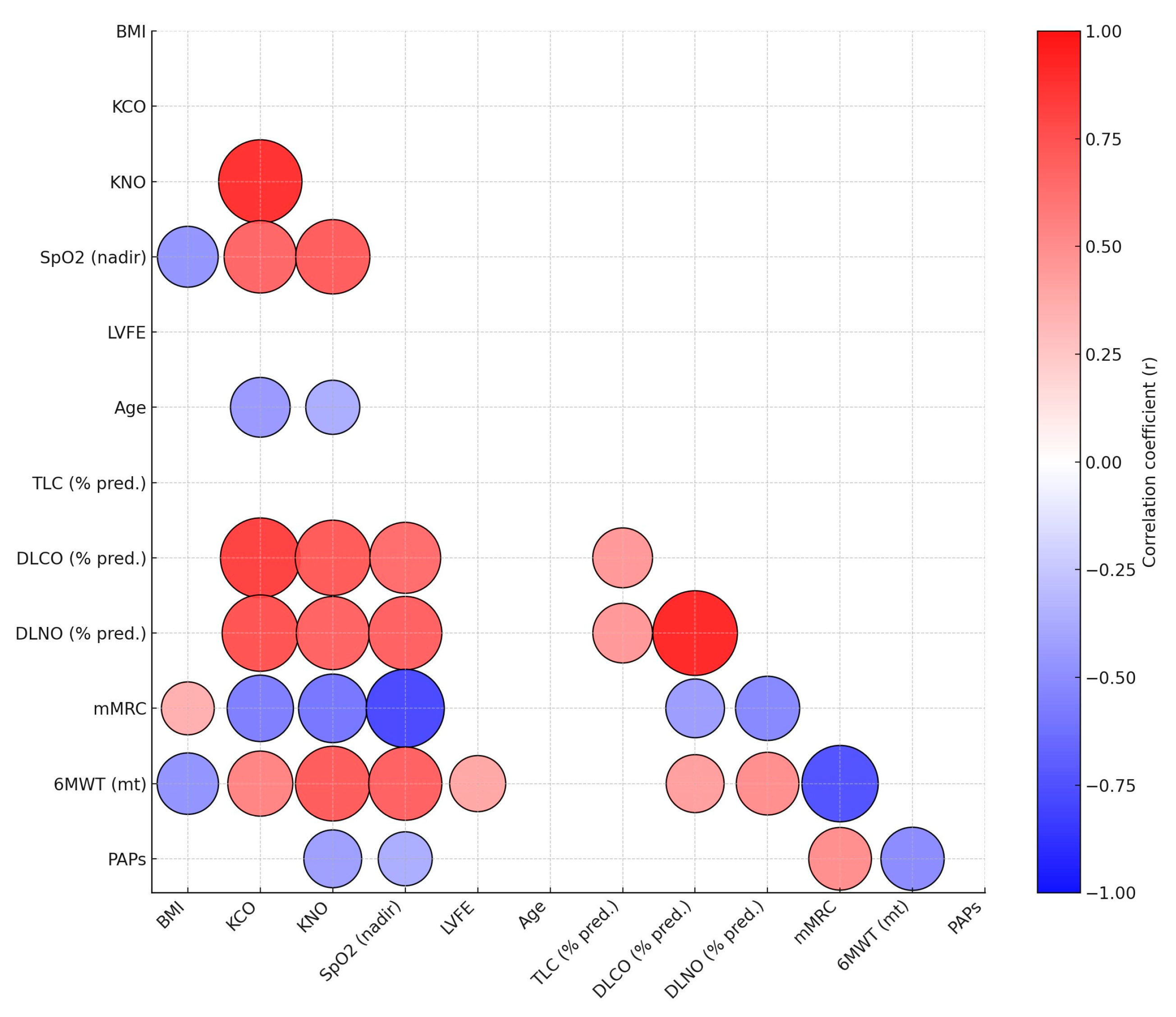 Correlations between clinical, functional, and echocardiographic parameters were evaluated using Pearson’s correlation test (Figure 1). The parameters analyzed included body mass index (BMI), DLCO, Carbon Monoxide Transfer Coefficient (KCO), DLNO, nitric oxide transfer coefficient (KNO), peripheral oxygen saturation (SpO2 nadir), Left Ventricular Ejection Fraction (LVEF), age, TLC % pred., DLCO % pred., mMRC dyspnea score, 6MWT distance (meters), and estimated PAPs. Statistical significance was defined as a p-value < 0.05. Given the exploratory nature of the study, p-values were interpreted descriptively rather than confirmatorily.