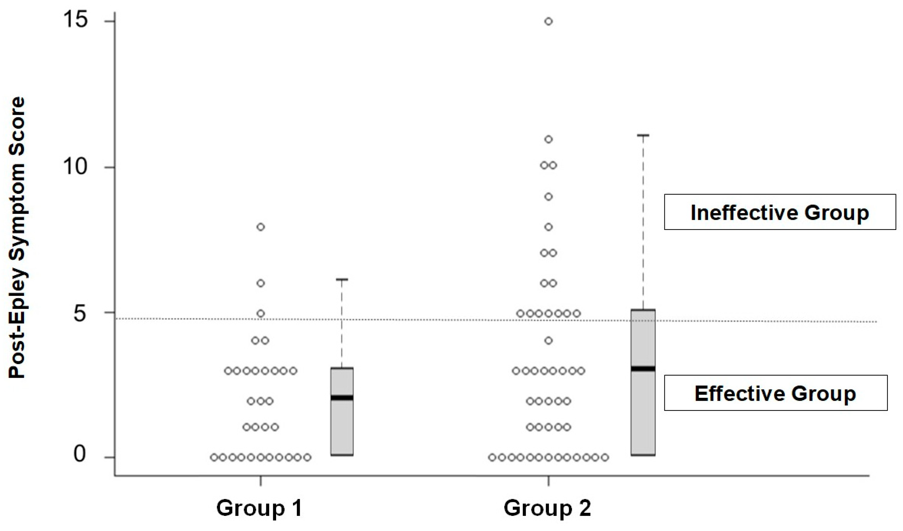 Individual post-Epley symptom scores on a 0–10 scale are shown for each group. (Group 1, n = 31; Group 2, n = 49). Overlaid box-and-whisker plots represent the distribution of post-treatment scores, with the boxes indicating the interquartile range (IQR), the bold horizontal line representing the median, and the whiskers extending to the minimum and maximum values within 1.5 × IQR. Patients with post-Epley symptom score < 5 were classified as effective, and those with scores ≥ 5 as ineffective; the cutoff is indicated by the horizontal dotted line. The proportion of patients classified as effective was significantly higher in Group 1 than in Group 2 (p = 0.016). 10, the median post-Epley symptom score was 2 (IQR, 0–3) in Group 1 and 3 (IQR, 0–5) in Group 2. Symptom reduction was significant within each group (both p < 0.001). Comparison of the two groups revealed no statistically significant difference in post-treatment scores (p = 0.095), although Group 1 exhibited numerically lower scores overall.