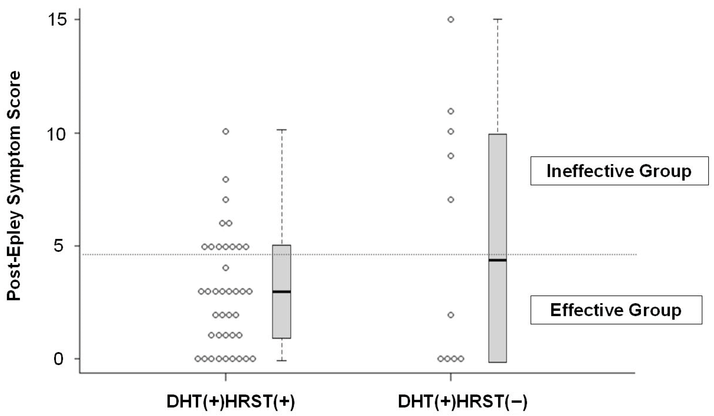 Figure 2). The DHT(+)/HRST(+) subgroup included 39 patients, with a median post-Epley symptom score of 3 (interquartile range [IQR], 1–5), whereas the DHT(+)/HRST(−) subgroup consisted of 10 patients, with a median post-Epley symptom score of 4.5 (IQR, 0–9.75). There was no significant difference in post-Epley symptom scores between the two subgroups (