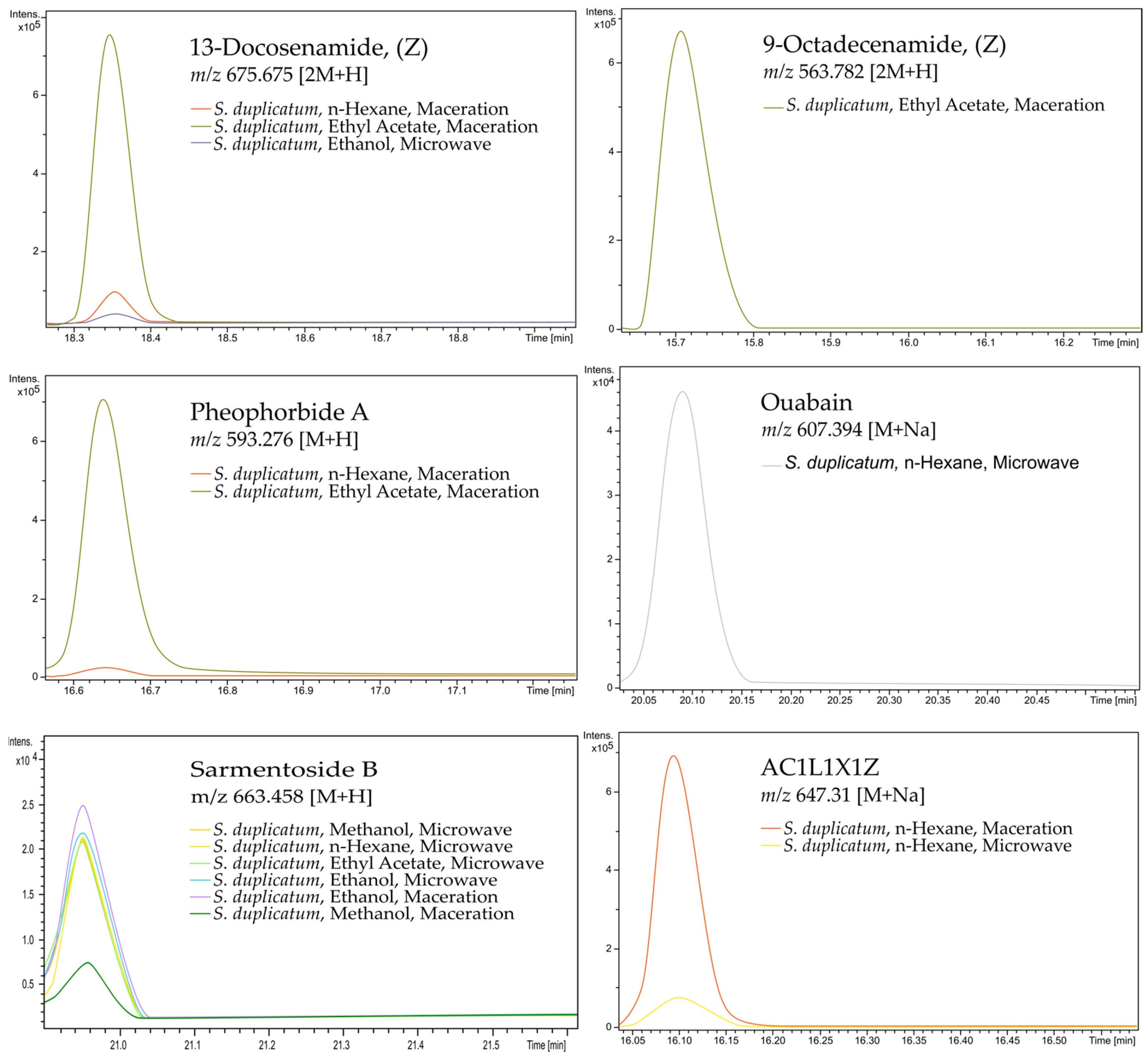 | 20.05–20.15 | Ouabain | Terpenoids | C29H44O12 | 607.394 | [M + Na]+ | 584.7 g/mol |