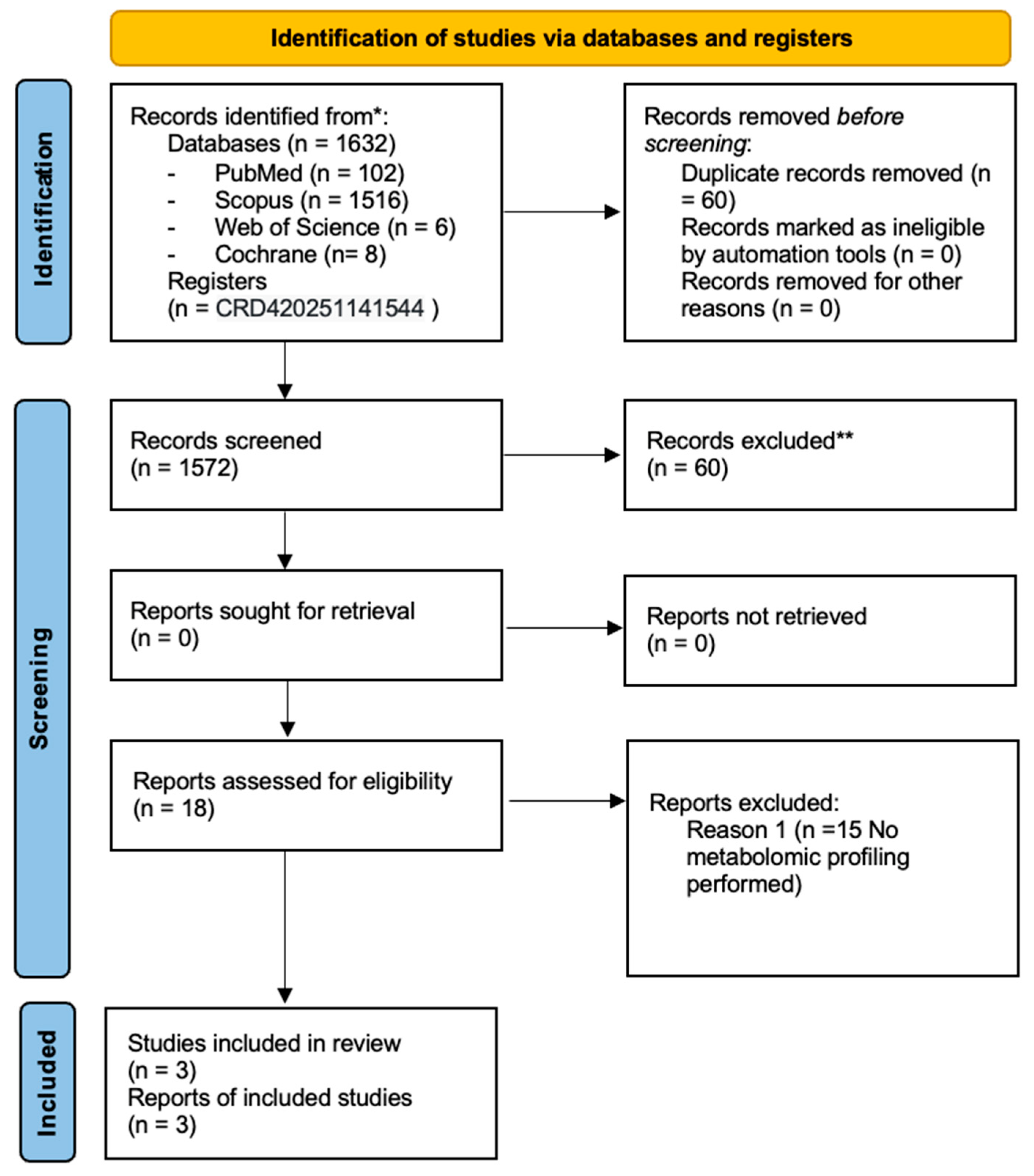 - Clinical studies investigating the association between orthodontic treatment and metabolomic analysis, without restrictions on study design. This included cross-sectional, retrospective, and prospective studies. No predefined age restrictions were applied during study selection.
