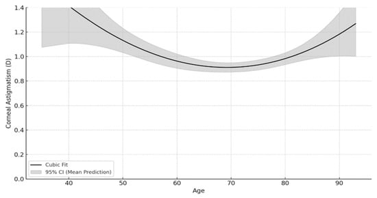 In the comparison among age groups, the level of corneal astigmatism was highest in the 40–49 age group (p < 0.05). The median corneal astigmatism was found to be 1.04 (0.00–3.14) in the 40–49 age group, 0.86 (0.1–4.98) in the 50–59 age group, 0.74 (0.1–5.62) in the 60–69 age group, 0.79 (0.1–8.31) in the 70–79 age group, and 0.89 (0.11–5.02) in the 80 and older age group. According to the post hoc analysis results, the mean corneal astigmatism value of the 60–69 age group was significantly lower than both the 50–59 age group (p = 0.002) and the ≥80 age group (p = 0.003). The cubic regression curve (Figure 2) created in the study to model the association between age and corneal astigmatism magnitude reveals that this association is not linear (p < 0.001). According to the model obtained, corneal astigmatism levels are relatively high at younger ages (especially between the ages of 40–60). As age increases (between the ages of 60–70), a significant decrease in corneal astigmatism is observed. After the age of 70, an increase in astigmatism occurs again. This shows that there is a U-shaped nonlinear association between age and corneal astigmatism.