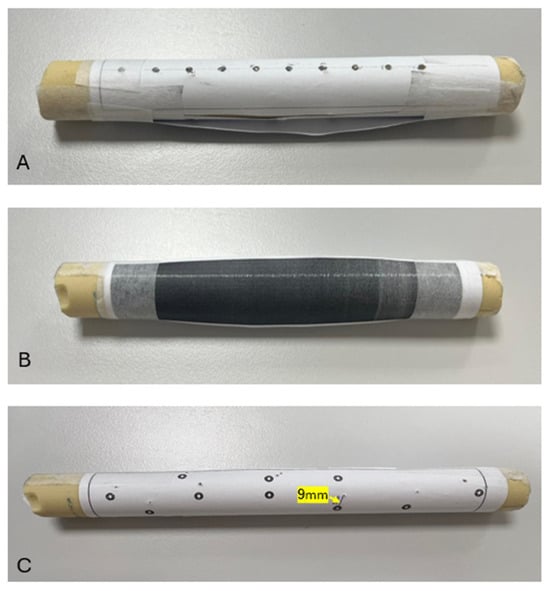 (A) Preparation of the Saw bone with 10 marked entry points. (B) The exit area is concealed from the participant’s view. (C) Desired exit points and the holes created by K-wire insertion.