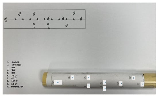 The instructional sheet includes numbered targets, each with a designated directional objective. For example, point number 2 is to be directed vertically upward, corresponding to the 12 o’clock position.