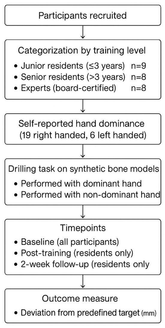 While the Shapiro–Wilk test was used to assess data normality, the small sample size limits the statistical power and the ability to formally confirm normality for each individual measure. Future studies with larger cohorts should perform full normality testing for each outcome measure and consider non-parametric analyses (e.g., Mann–Whitney or Wilcoxon tests) to confirm these findings. Despite this limitation, the study provides preliminary evidence of the concept using a simple and feasible training model. p-values near the significance threshold should be interpreted cautiously, as results are exploratory and require confirmation in larger studies. Although the study did not include a formal test–retest reliability assessment, the measurement protocol was carefully standardized. Future research should incorporate reliability testing to further validate the method and ensure reproducibility of the results. Although left-handed participants showed relatively better non-dominant hand performance, the small size of this subgroup (n = 6 overall; n = 4 among residents) limits the strength of conclusions regarding handedness. The study was conducted at a single institution, which may not represent the broader population of orthopedic surgeons. While synthetic bone models provide standardization, they may not fully replicate the complexity and variability of human bone encountered in clinical practice. Expert surgeons participated only in the baseline assessment, limiting our ability to evaluate the association with training, across all experience levels. All measurements were performed by a single, experienced investigator who reviewed all data across participants, providing high internal consistency. However, formal inter-rater reliability was not assessed, and future studies could include multiple raters to further confirm measurement precision and reproducibility. Finally, the 2-week follow-up period may not be sufficient to assess long-term skill retention.