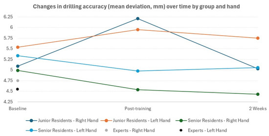 In contrast, among junior residents, no significant effect of time was found for right-hand accuracy (F(2,16) = 0.65, p = 0.537), despite a numerical decrease from baseline to post-training (4.98 ± 0.54 mm) and to the 2-week follow-up (4.71 ± 1.50 mm). Similarly, left-hand accuracy showed no significant effect of time (F(2,16) = 0.19, p = 0.828), with values remaining stable from baseline (5.54 ± 1.39 mm) to post-training (5.40 ± 1.30 mm) and at the 2-week follow-up (5.42 ± 1.50 mm) (Table 2).