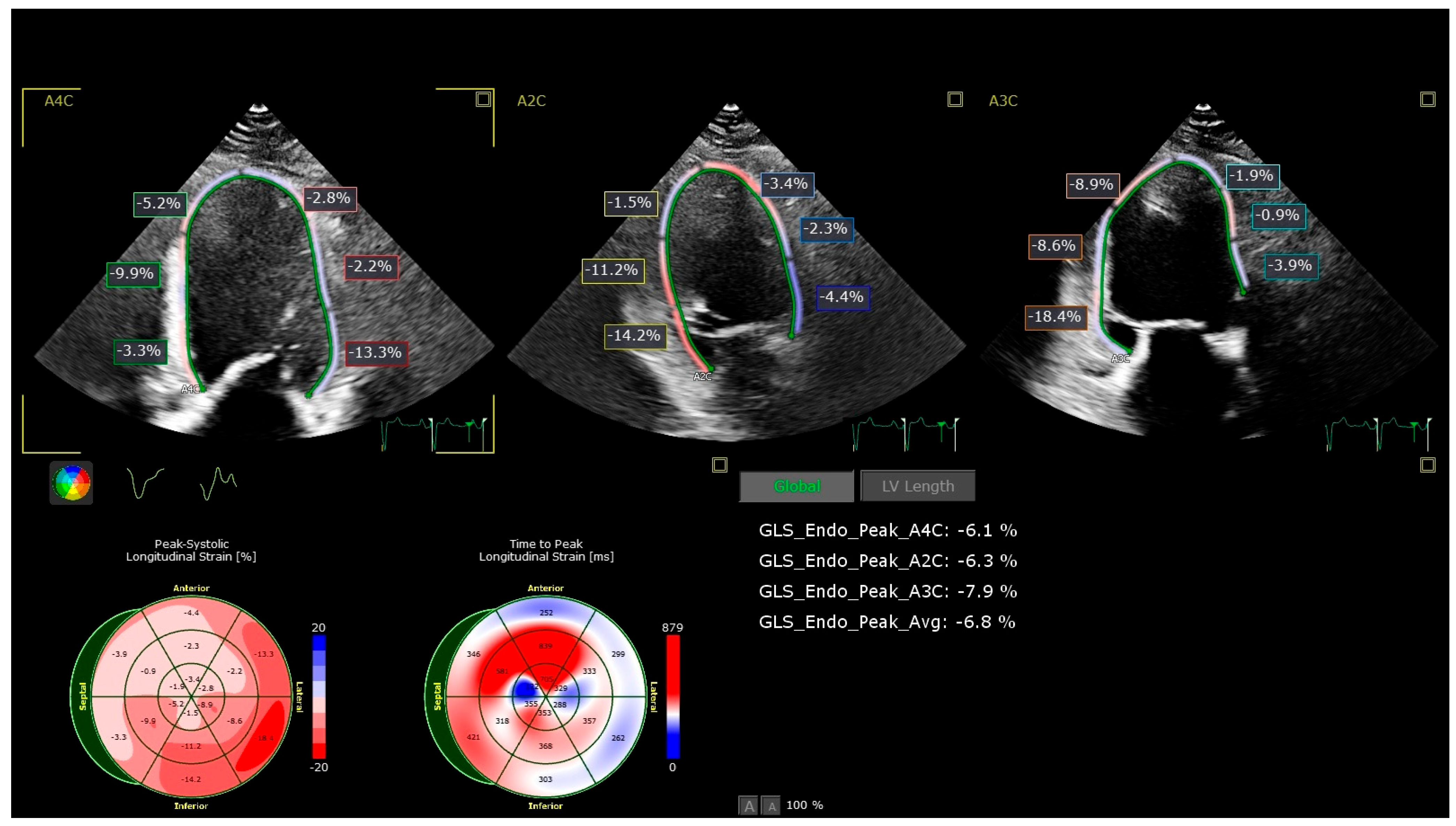 - Global longitudinal strain (GLS): Assessed by 2D speckle-tracking echocardiography using apical views (four-chamber, two-chamber, and long-axis). The endocardial border was manually traced, and tracking was automatically performed, with manual adjustments as necessary. A GLS value less negative than −19% (i.e., >−19%) was considered abnormal based on vendor-specific reference ranges.