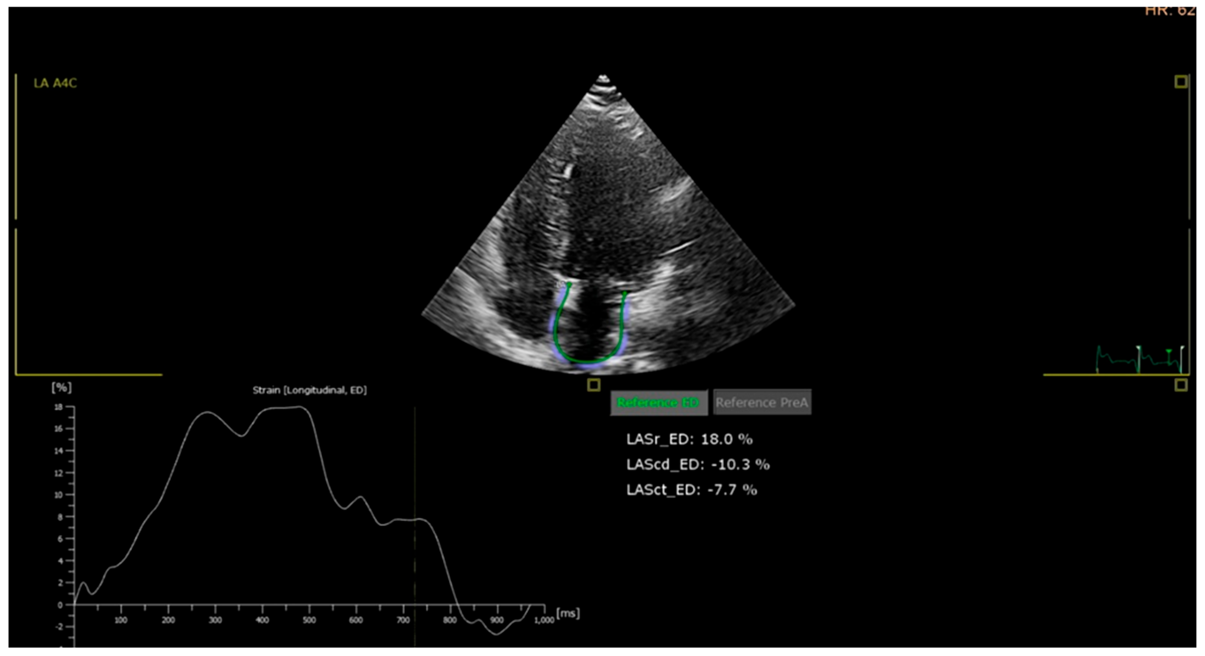 - Left atrial (LA) strain: LA reservoir strain was measured using speckle-tracking from apical four-chamber views focused on the left atrium. A value below 35% was considered abnormal, based on the lower limit of the 95% confidence interval observed in the control group and supported by literature data.