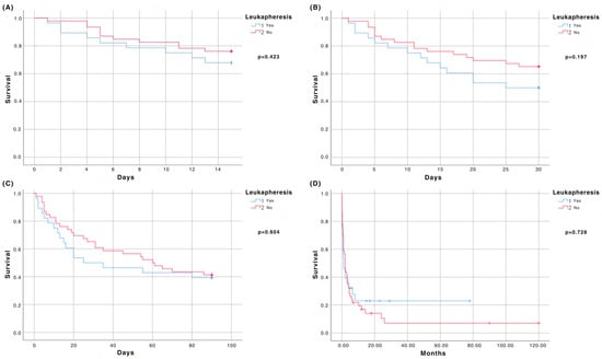 - Lee, H.; Han, J.H.; Kim, J.K.; Yoo, J.; Cho, H.S.; Yoon, J.-H.; Cho, B.S.; Kim, H.-J.; Lim, J.; Jekarl, D.W.; et al. Effectiveness of Leukapheresis on Early Survival in Acute Myeloid Leukemia: An Observational Propensity Score Matching Cohort Study. J. Clin. Apher. 2023, 38, 727–737. [Google Scholar] [CrossRef]