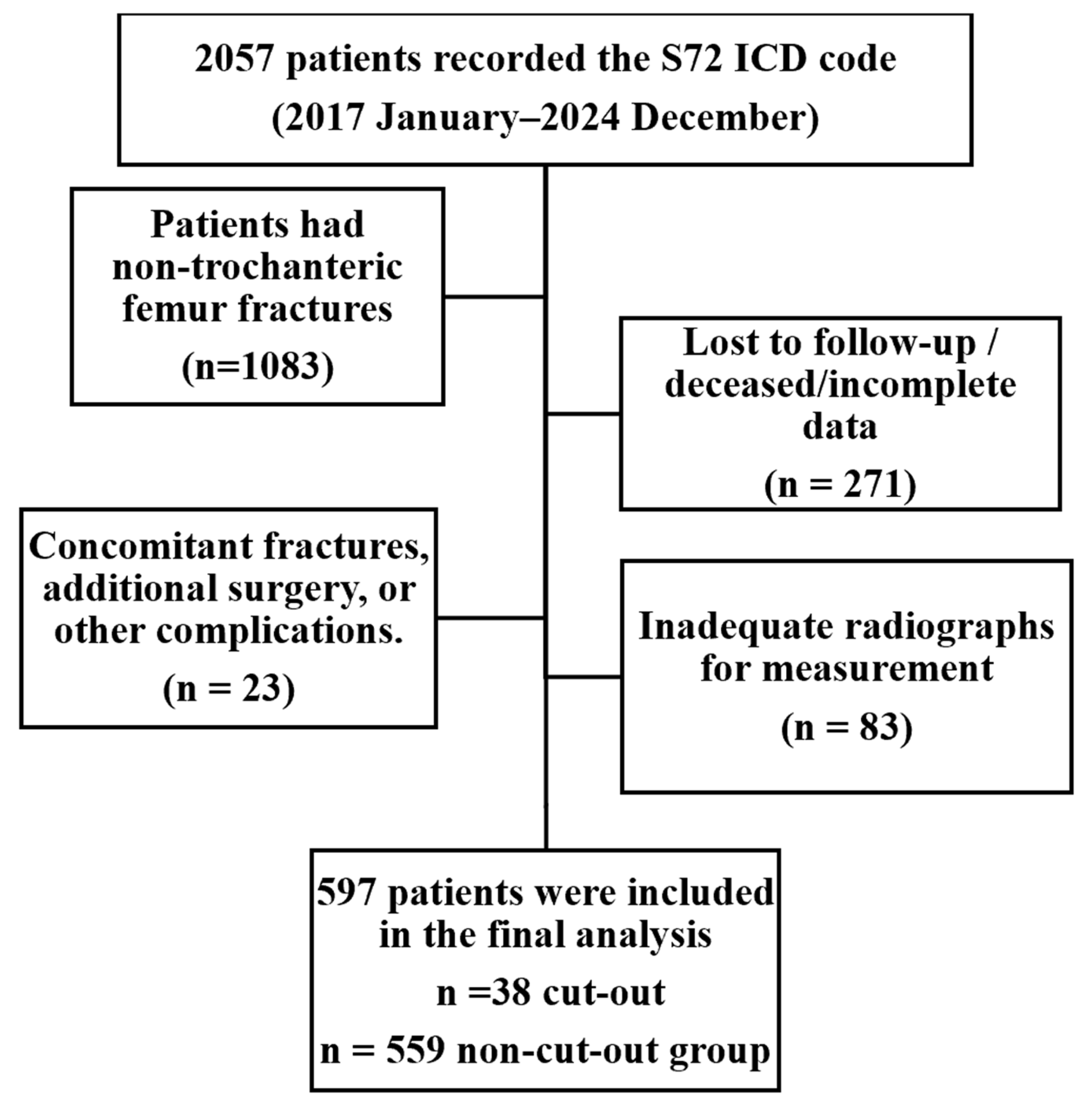 - Kulakoglu, B.; Ozdemir, G.; Bingol, O.; Karlidag, T.; Keskin, O.H.; Durgal, A. A new scoring system for predicting cut-out risk in patients with intertrochanteric femur fractures treated with proximal femoral nail anti-rotation. Acta Orthop. Traumatol. Turc. 2023, 57, 258. [Google Scholar] [CrossRef]