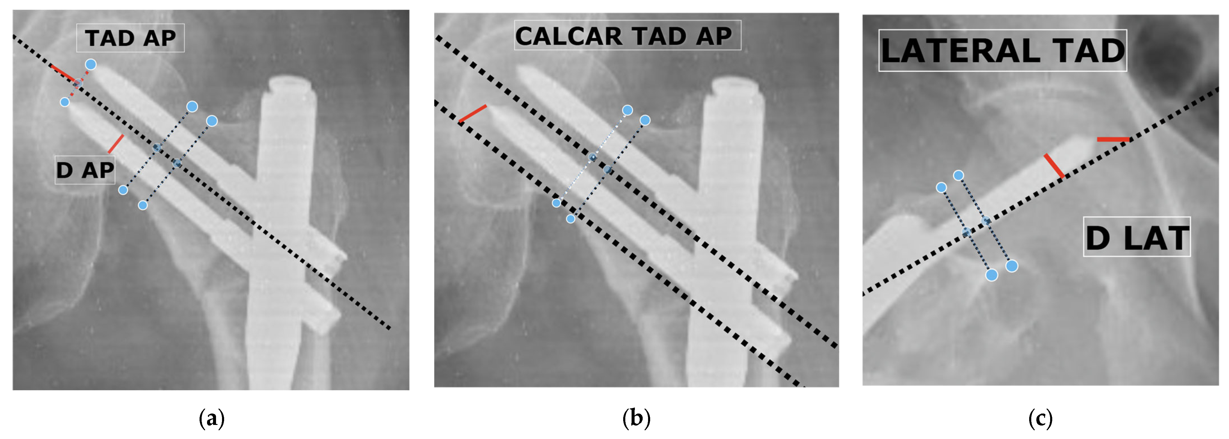 - Vemparala, R.; Rajan, G.; Narayanan, S.; Kumar, S.; Salim, P.; Ramachandran, R. Comparative analysis of TAD and CalTAD in predicting lag screw cutout risk in trochanteric fractures treated with intramedullary devices: A retrospective study. Int. J. Res. Orthop. 2025, 11, 771–778. [Google Scholar] [CrossRef]