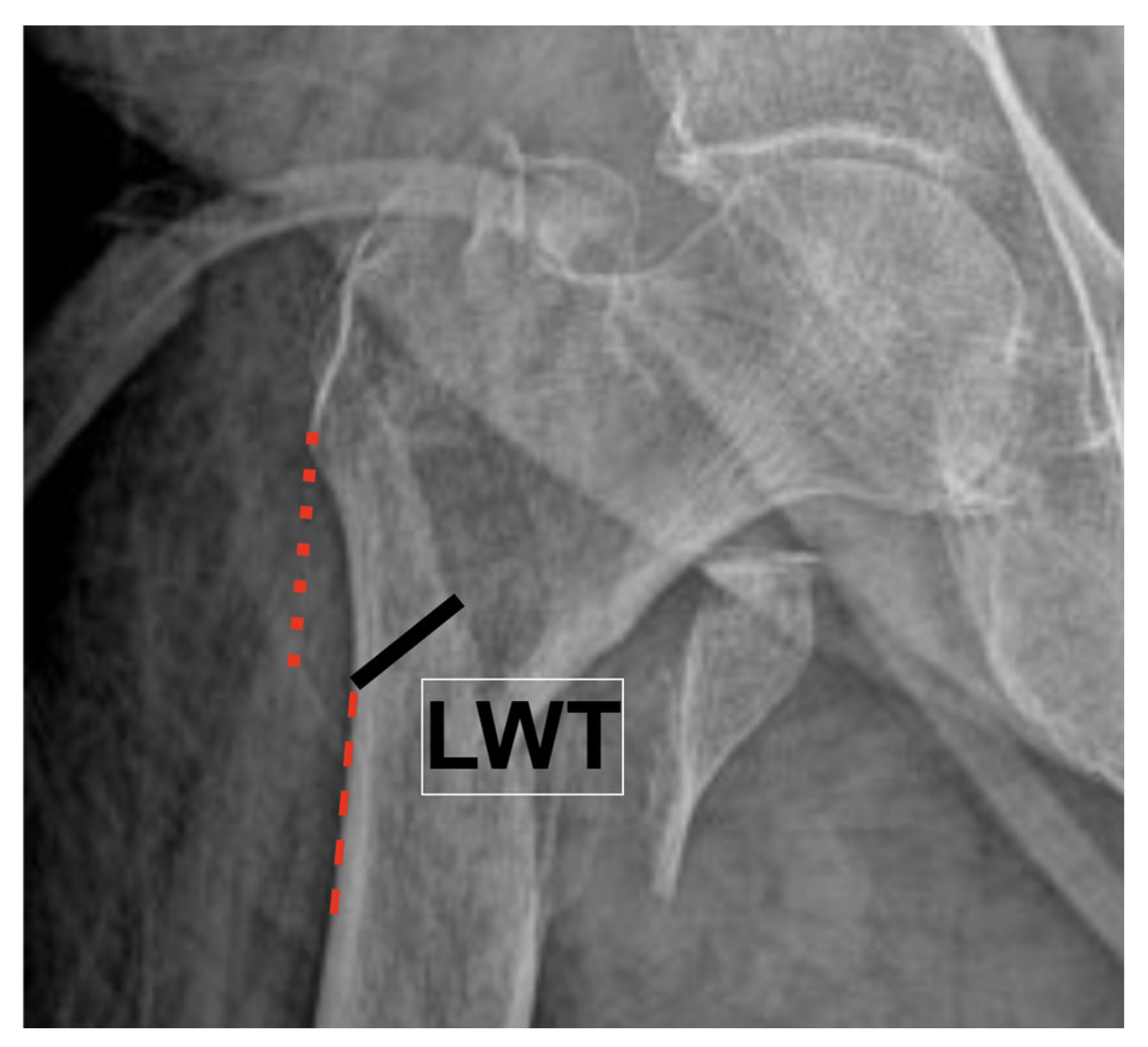 - Fahim, M.E.M.; Rakha, I.I.; Ghazal, M.A.; Al Greatly, M.A.T.; Al Hady, M. Proximal Femoral Lateral Wall Thickness as a Predictor of Fixation Outcome in Stable Intertrochanteric Fractures: A Prospective Cohort Study. Egypt. J. Hosp. Med. 2025, 100, 3644–3650. [Google Scholar] [CrossRef]