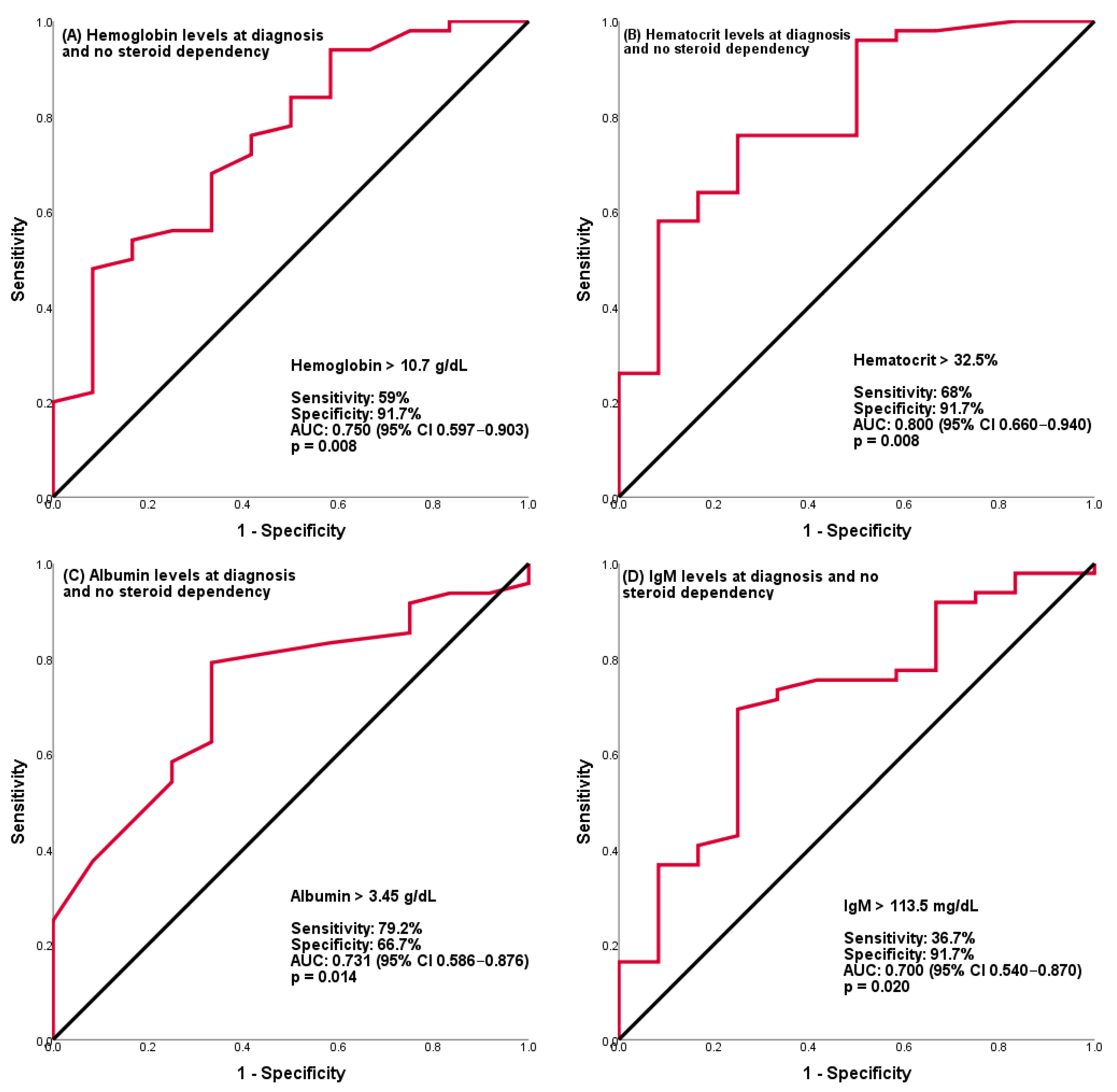 In the assessment of the correlation between laboratory parameters and disease prognosis, a number of studies have identified anemia, hypoalbuminemia, thrombocytosis, and peripheral eosinophilia as potential indicators of steroid dependency and of the necessity for biological agent treatment. In our study, hemoglobin and hematocrit levels were found to be significantly low in the steroid-dependent patient group; however, hemoglobin and hematocrit levels above 10.7 g/dL and 32.5%, respectively, were found to be significant in terms of not developing steroid dependency with AUC: 0.75, 50% sens., 91.7% spec., and AUC: 0.80, 58% sens., 91.7% spec., respectively. The study by Gasparetto et al. found an association between low hemoglobin levels and severity of disease [